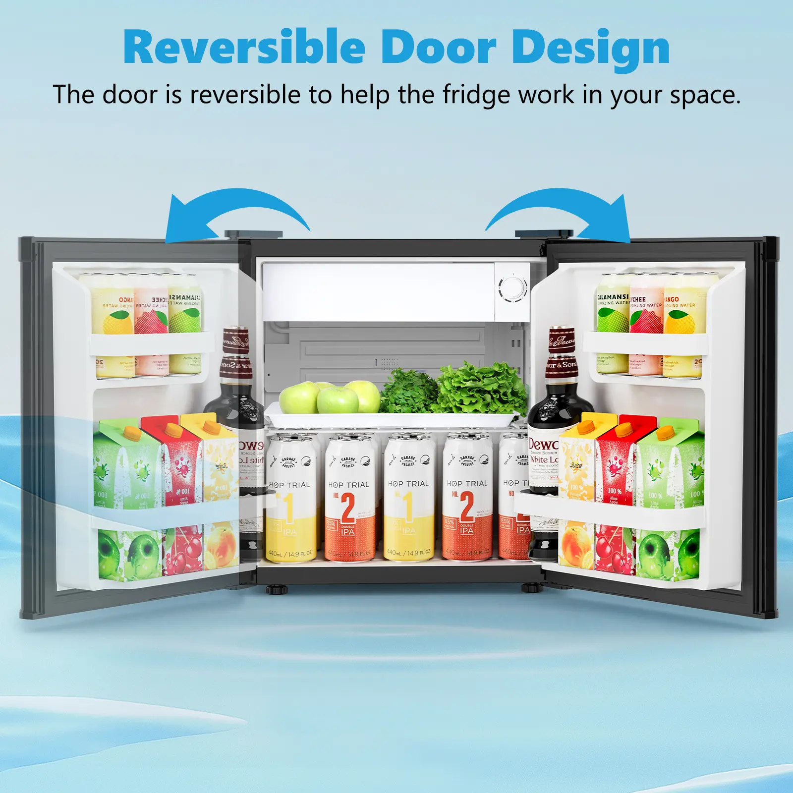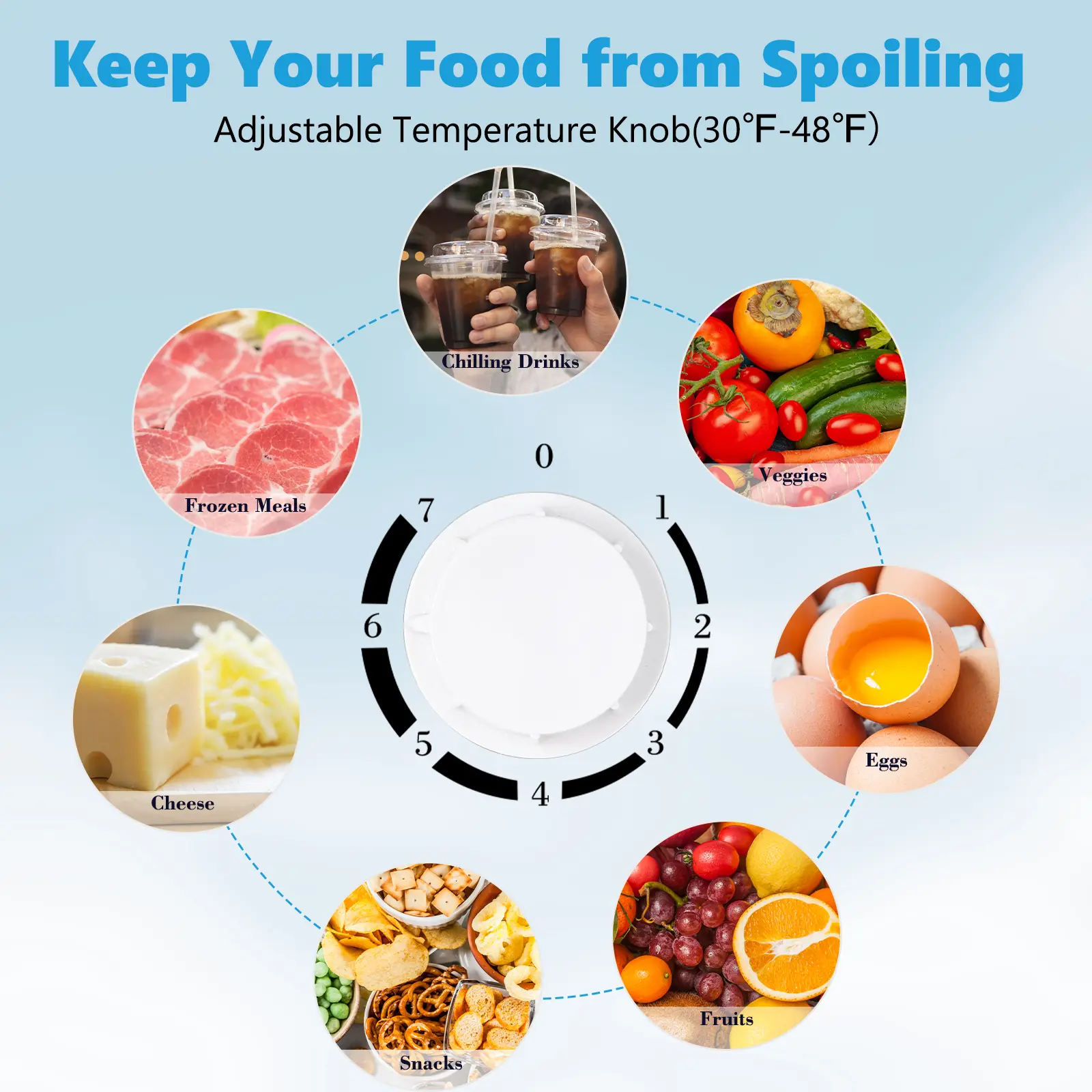 ·This Mini Fridge has a rotary thermostat button inside. The freezer has a temperature range of 32°F to 50°F (not suitable for storing ice cream) and the fridge offers 7 variable temperature settings depending on your needs. Cold storage and larger freezer compartment for storing beverages, fruits, face masks or a small amount of frozen food.
