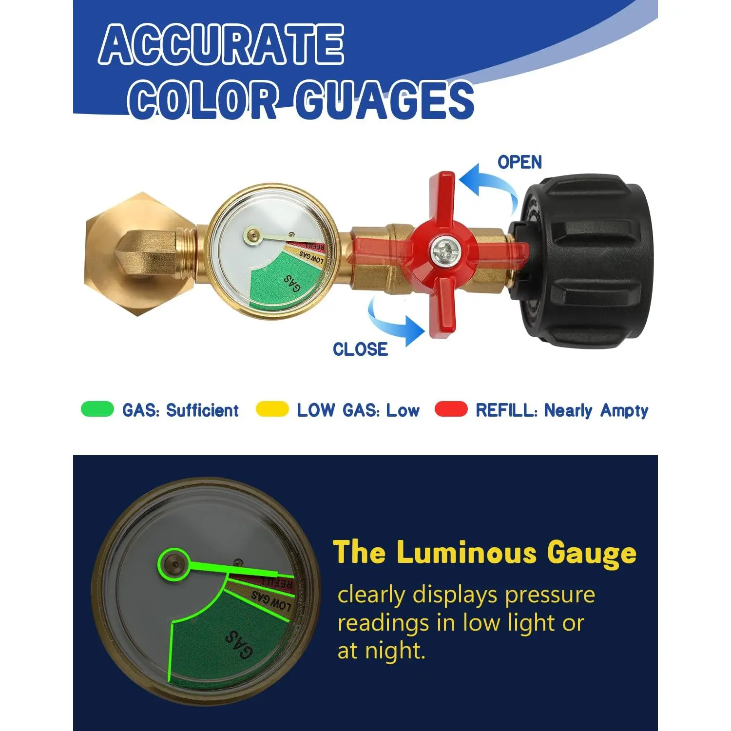 ·No Tools Needed: Simply hand-tighten the knob to connect directly from a 20-pound tank or 16-ounce canister to a 1-pound bottle. Refill in under a minute, even for beginners. The glow-in-the-dark gauge monitors pressure in low light.