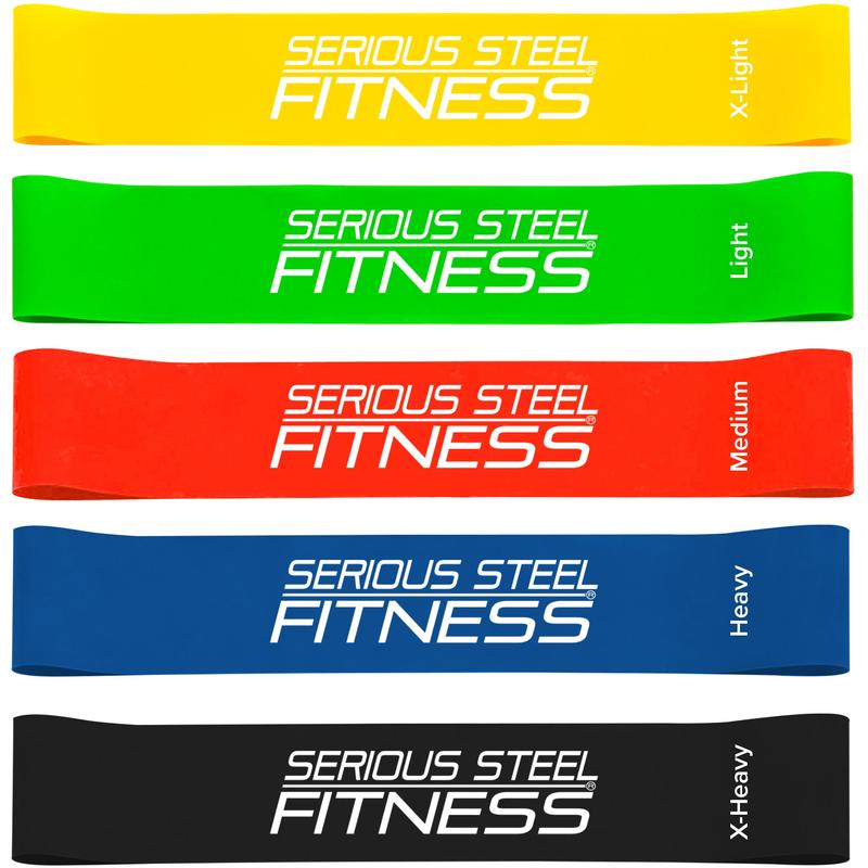 These bands come in five (5) sizes, a bag and a quick guide insert. Use Serious Steel 12" Mini loop bands for glute bridges, abduction, adduction, lateral walks and more!