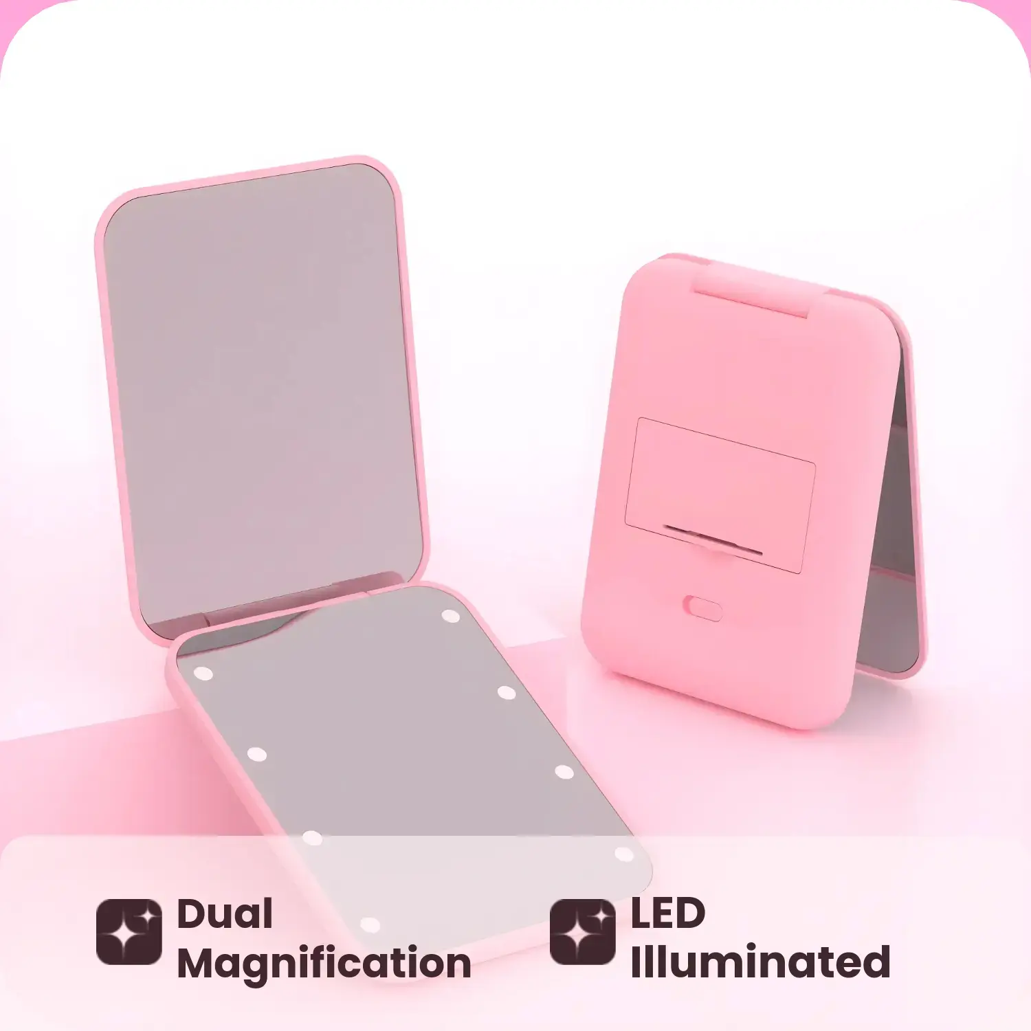 This mirror is really pretty and it fits in my cosmetic bag. The light is pretty bright it helps me to see more and I like how it has 2 sides. Hopefully it last long enough n not just few days or weeks.