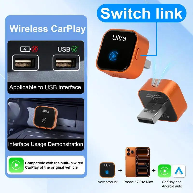 2026 New Mini Orange Wireless CarPlay & Android Auto Adapter: Wireless connection compatible with most vehicles, featuring one-tap switching and high-speed heat dissipation.