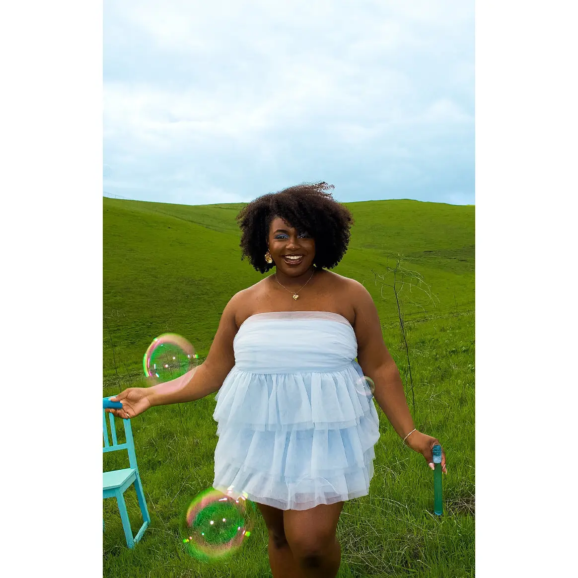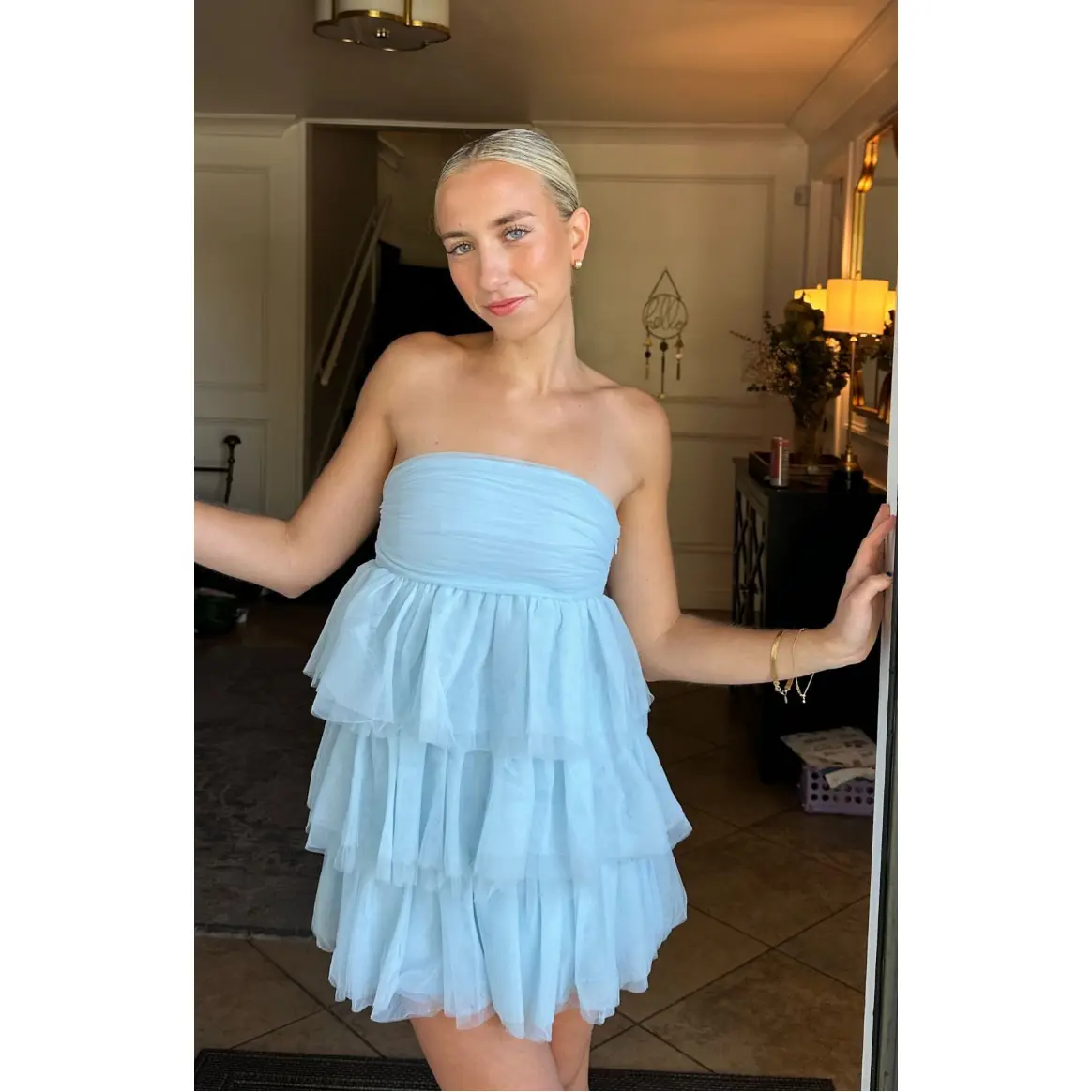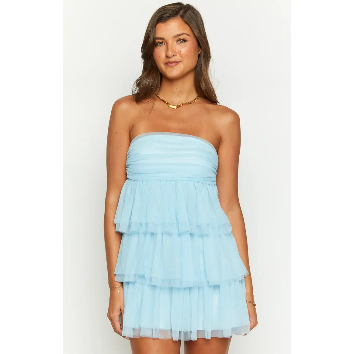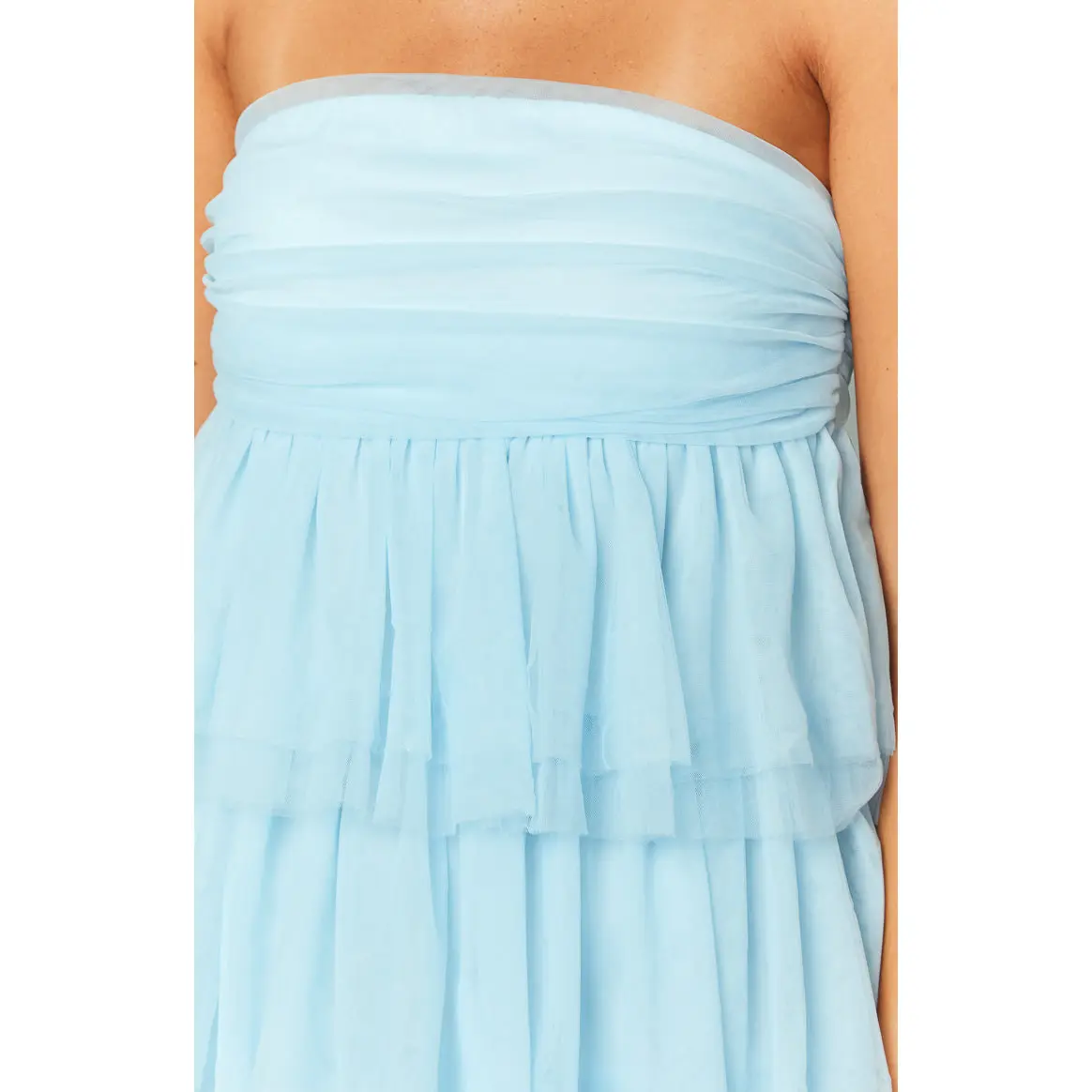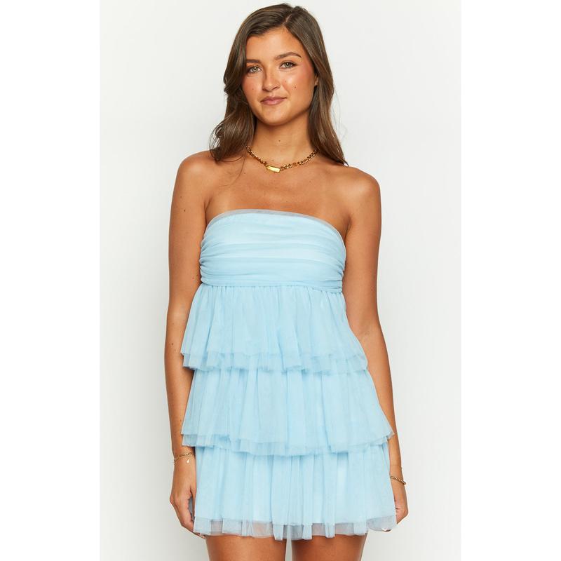 Blue Strapless Party Mini Dress How to style: This stunning blue mini dress is the perfect show stopping party outfit. With the beautiful tulle detailing this strapless mini dress will make heads turn and all eyes on you Features: