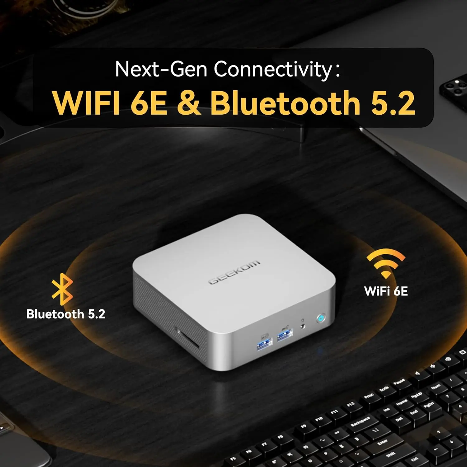 Up to 4× 4K or 1× 8K display support via HDMI 2.0 and USB4. Comprehensive connectivity includes Wi-Fi 6E, Bluetooth 5.2, 2.5 Gbps LAN, 6× USB ports, SD card reader, headphone jack, and Kensington lock slot. Experience maximum visual productivity with seamless multi-monitor connectivity.