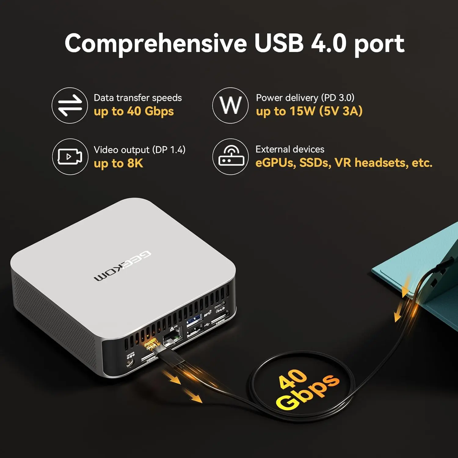 Dual copper heat pipes with 52% higher thermal dissipation capacity ensure efficient cooling. The compact, durable design features a metal chassis measuring just 0.47 L, withstands up to 200 kg pressure, and has VESA mount support. It offers low power consumption and reduced environmental impact.