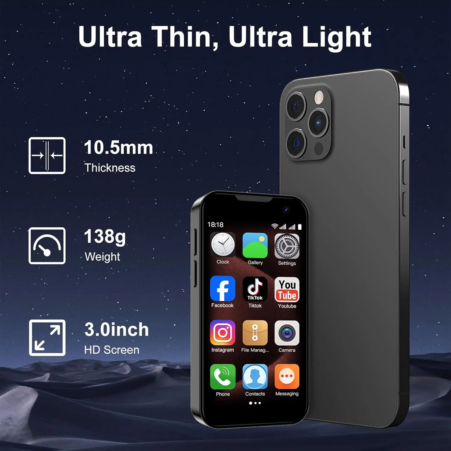 2.3.0" Quad-Core Mini Phone: This 3G mini smartphone features a 3.0-inch HD touchscreen with dimensions of 3.7 x 1.8 x 0.5 inches and weighs 0.3 lbs, which is approximately the size of a bank card.It is compact, lightweight, and convenient for one-handed use.It runs on a quad-core processor and Android 8.1, and it offers support for various functions, including voice and video calls, a camera, Google Play, WhatsApp, email, MP3, GPRS, Bluetooth, Wi-Fi, and hotspot sharing.