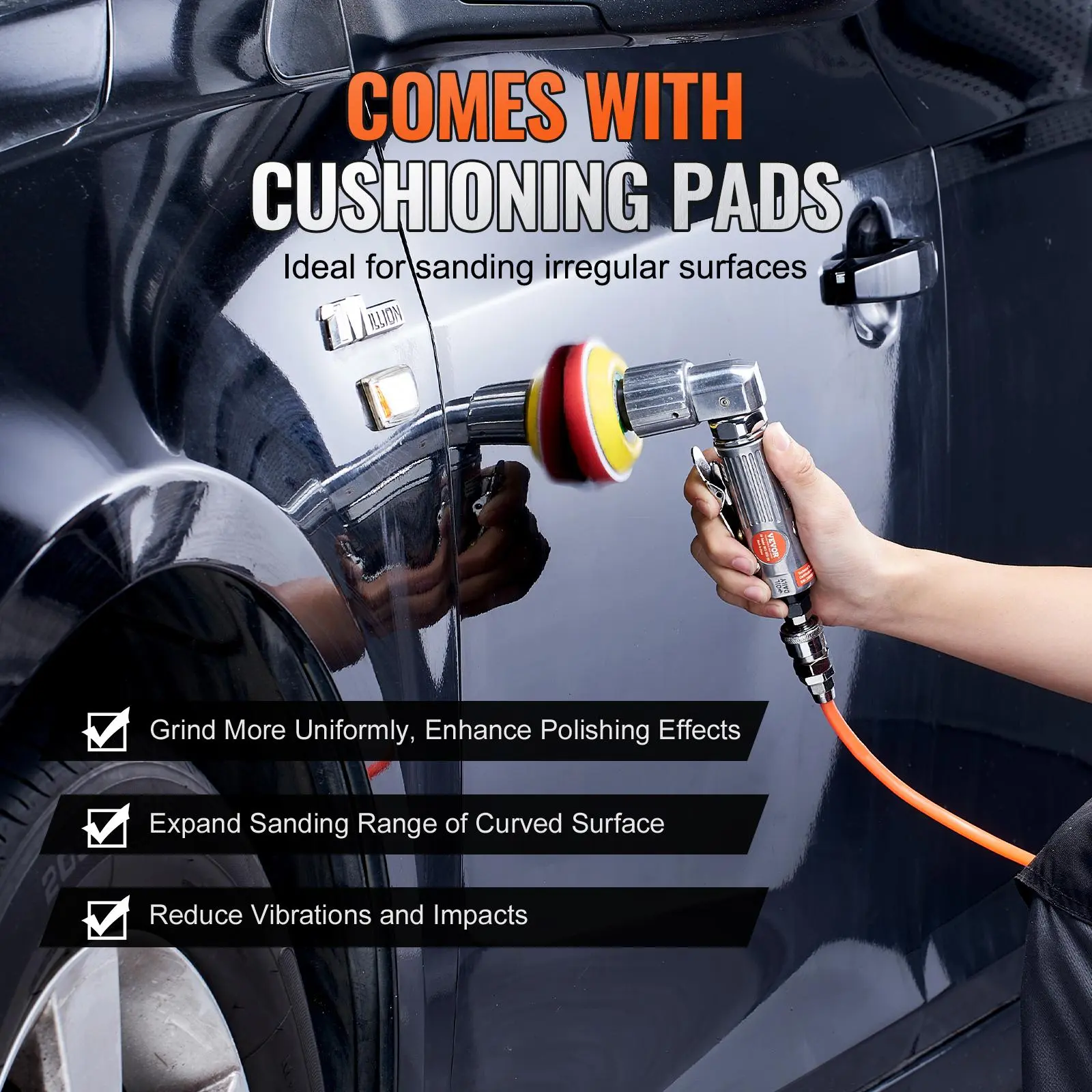 • Lower Vibration, More Stability: This random orbital air sander kit includes 3 cushioning pads (1/2/3 inches) that absorb vibrations and impacts, ensuring a smoother and more stable polishing process. Moreover, these pads can expand your polishing area and easily tackle workpieces of various shapes and curved surfaces.