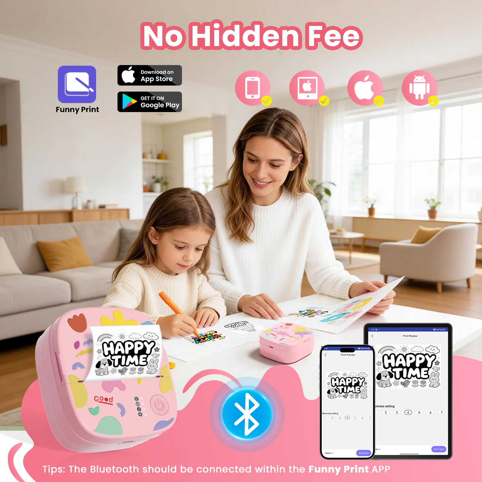 Print anytime, anywhere — just connect your smartphone via Bluetooth. Compatible with both iOS & Android: 1. Download the “FunnyPrint” app. 2. Long-press the power button until the light flashes. 3. Connect to “AH-M2” via Bluetooth and start printing!