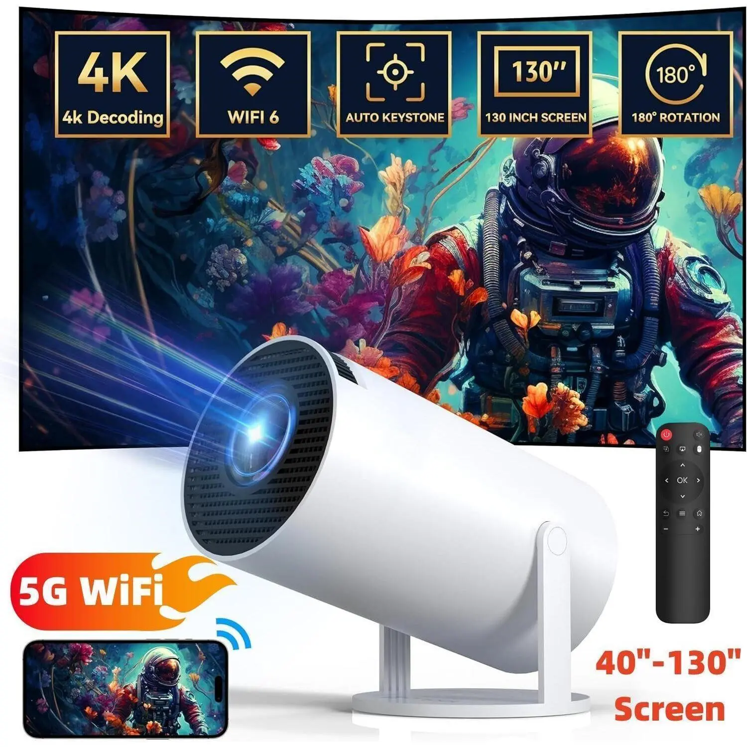 5G + 2.4G WiFi BT 5.0 Support 4K 130-inch screen Auto Keystone Correction 180° Rotation 3W Hi-Fi Speaker Portable Size 50-100% Zoom