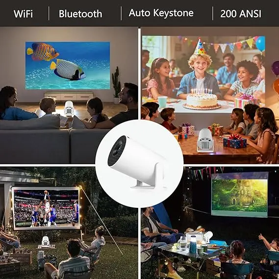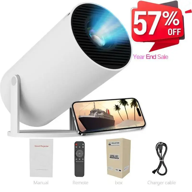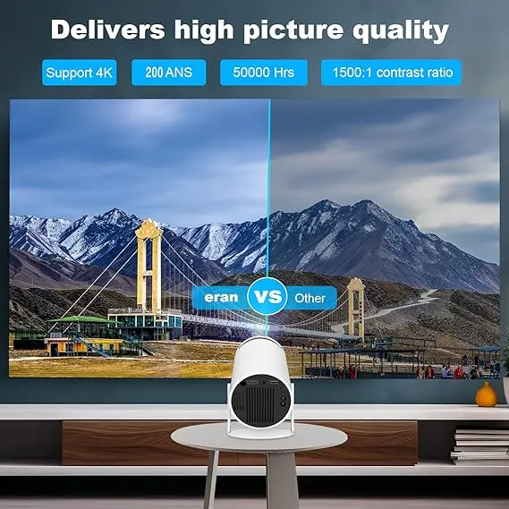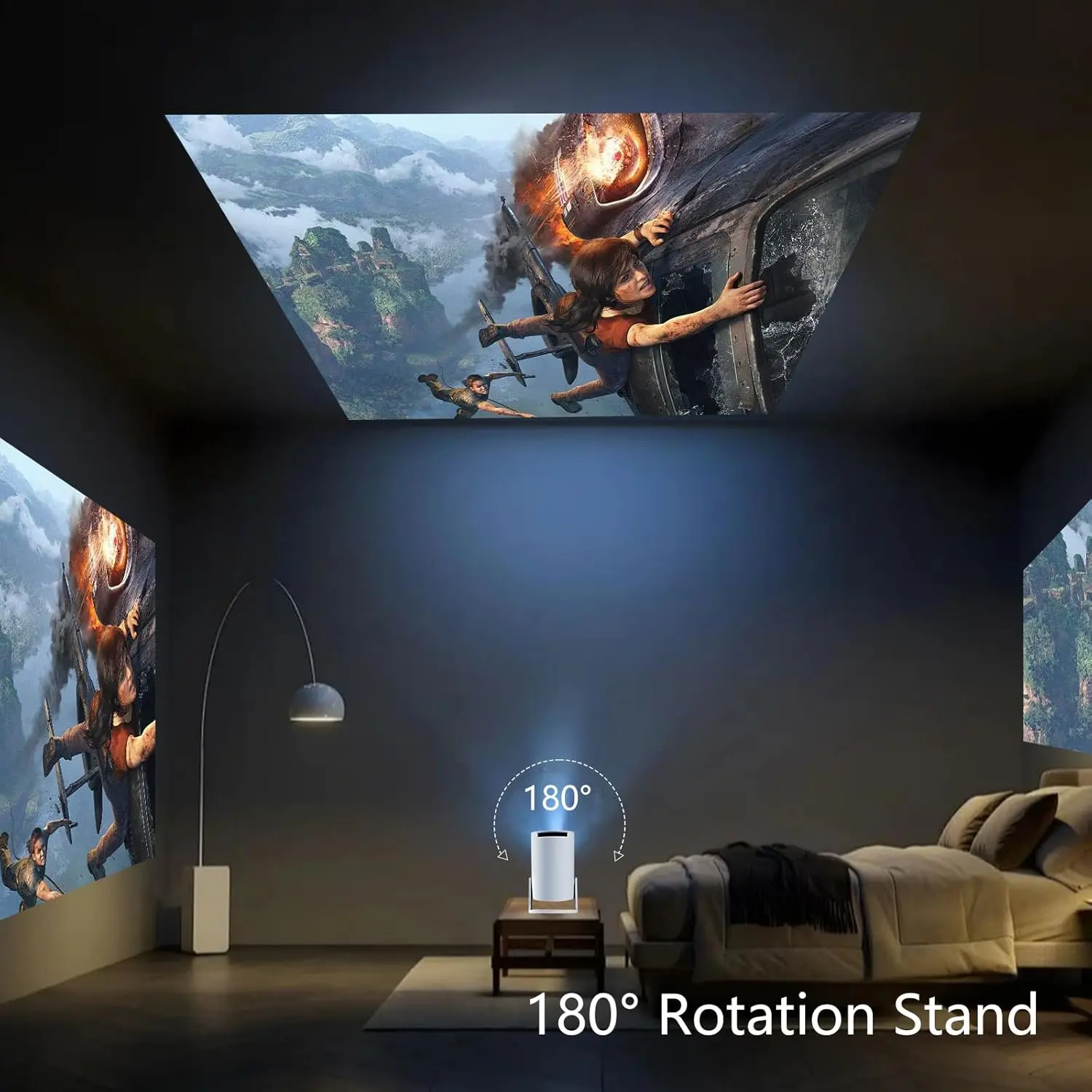 Bracket design: It has a stable triangular bracket with a 270° built-in, which allows you to easily adjust the angle and bring a perfect viewing experience. Weight: Only 1.32 pounds, small and lightweight. Function features: It can instantly project movies onto the ceiling and is suitable for indoor and outdoor movie nights. Accessories include a charging cable and a projector user manual.