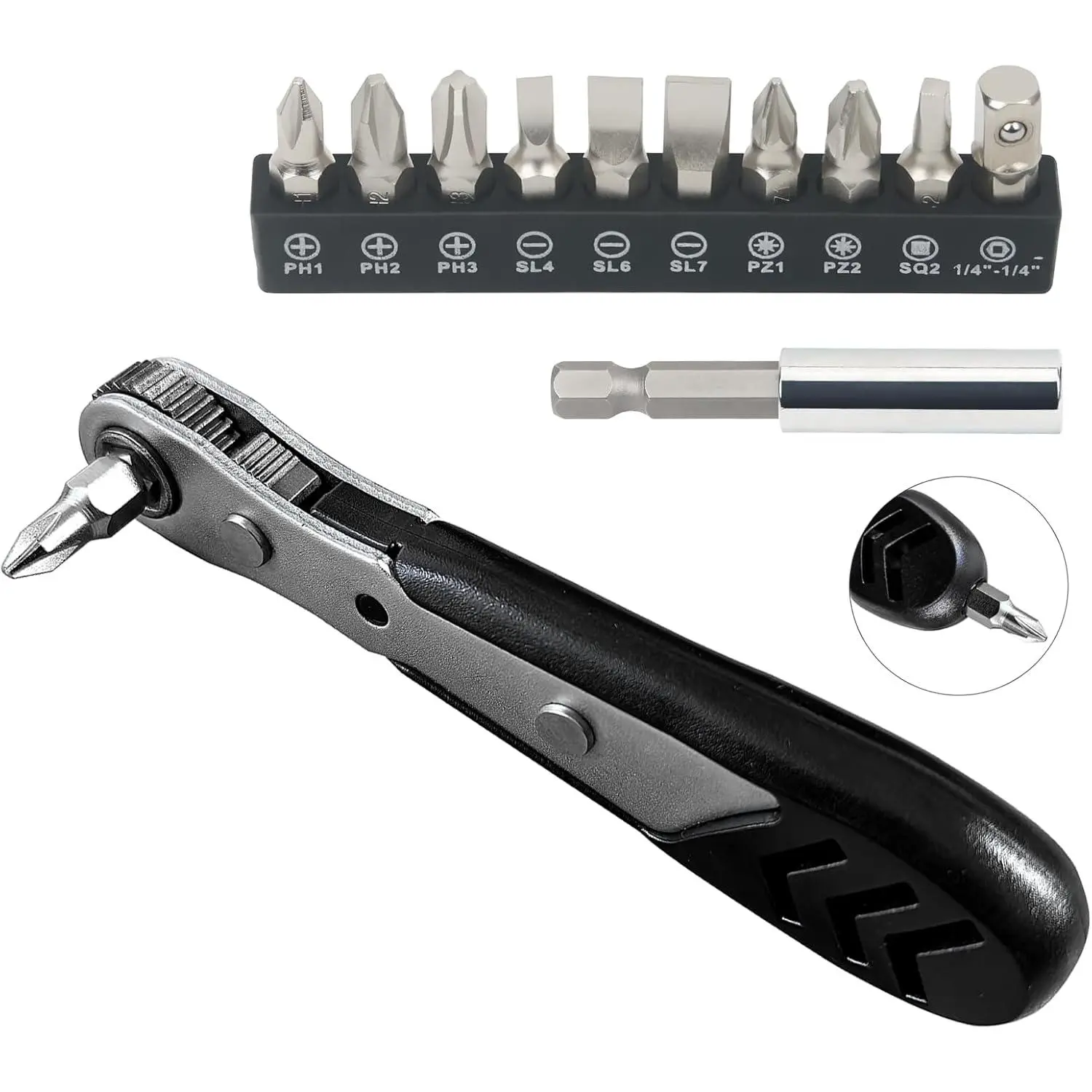 【Extensive Usage】More combinations suitable for more situations. With additional hex drive at the base of handle, this stubby ratchet could be as a bit driver or as a stand-alone , give you more possibility. The extension bar is for working in hard to reach areas, also ideal for for power tool, impact driver. Besides, 1/4" adapter accommodates for 1/4 sockets