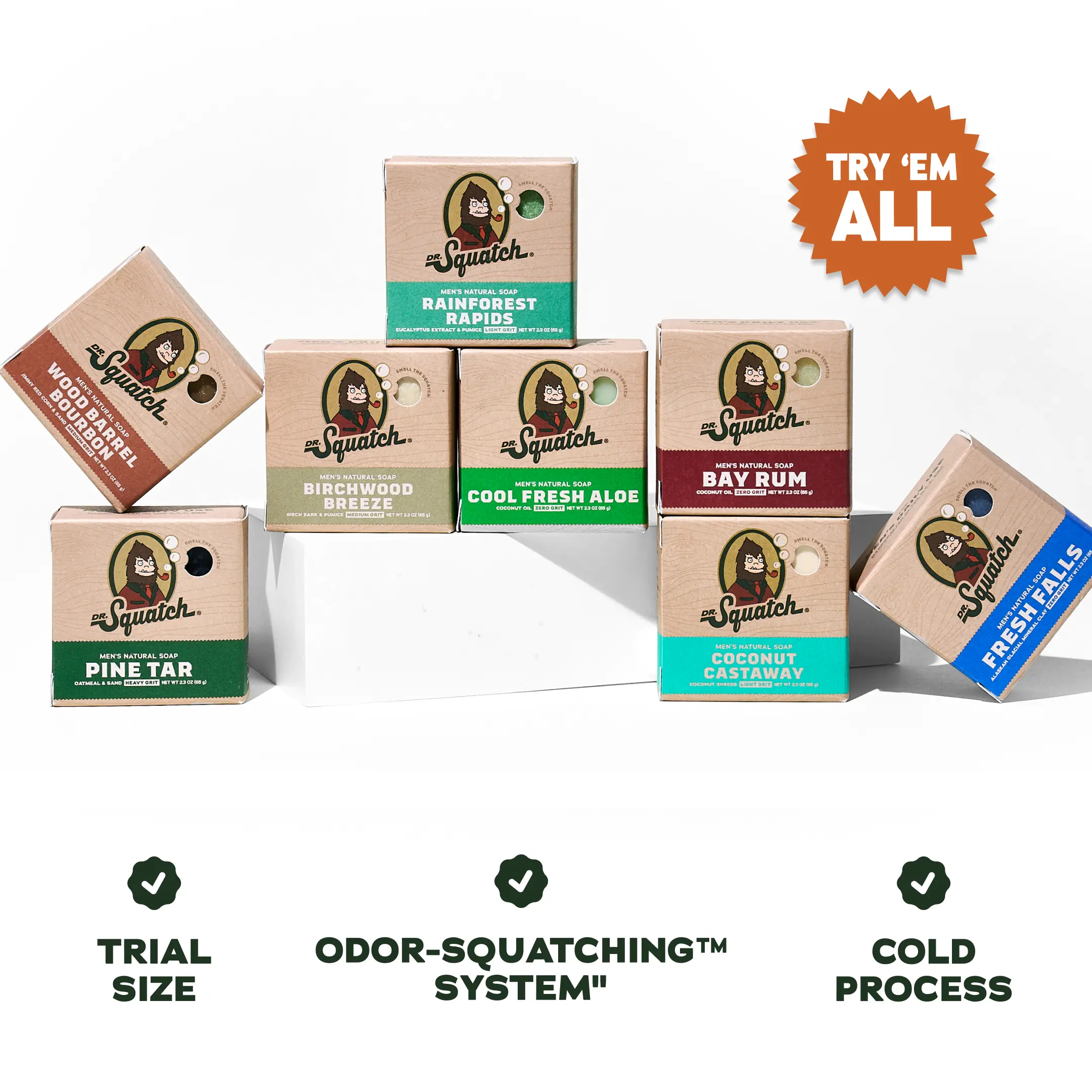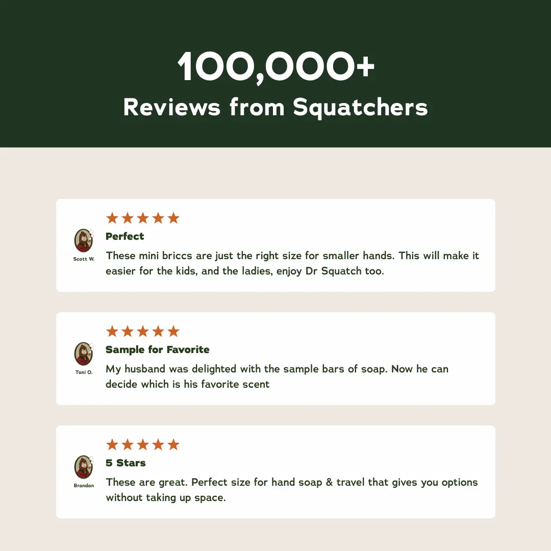 The ultimate way to try (or gift) Squatch. A limited-time bundle featuring soap, deo, lip balm, and an exclusive FREE Dr. Squatch toiletry bag.