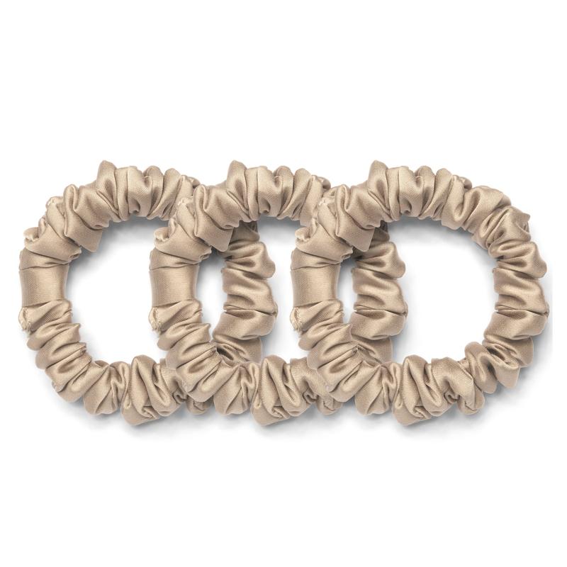 Simply gather hair in a ponytail or bun and wrap the scrunchie around. The Vegan Silk Mini Scrunchies are available in 3-packs of black, nude, sage green, or multicolor (1-black, 1-sage green, 1-nude).