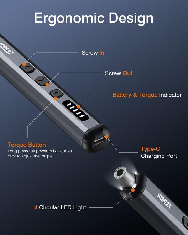 ·【Efficient and Convenient】JOREST precision electric screwdriver set has 5 adjustable electric gears level—different gears correspond to different torque(0.05 N.M, 0.09 N.M, 0.12 N.M, 0.15 N.M, 0.2 N.M)—and manual torque of 5 N.m, so that this set of tools can precisely meet your torque requirements for repairing different items. Equipped with 4 embedded LED lights to illuminate your work area, making it easy to operate in dark places.