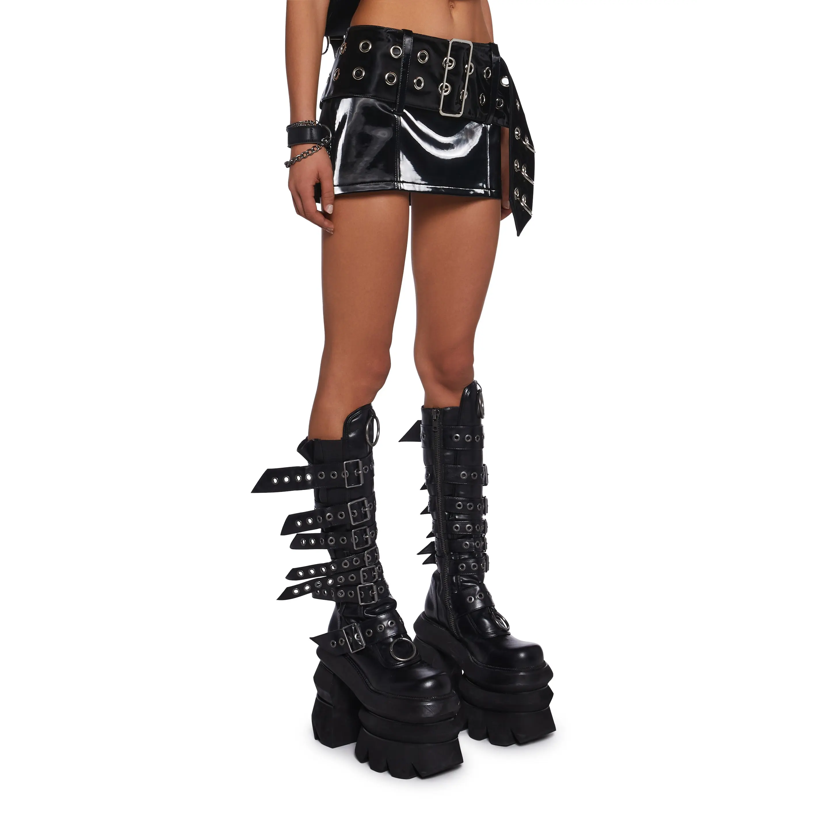 in a patent vegan leather construction. Large grommet detailing with O-ring hardware, a detachable belt with a buckle closure, a side zipper and closure, and a front embroidered ‘D’ logo.