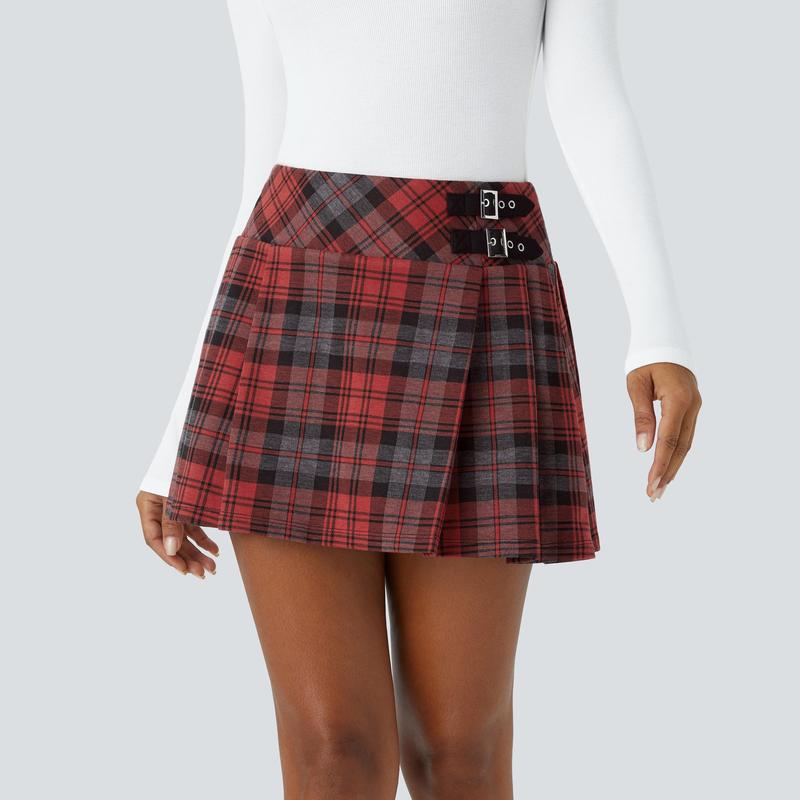 Halara High Waisted Decorative Buckle 2-in-1 Plaid Pleated Mini Casual Skirt