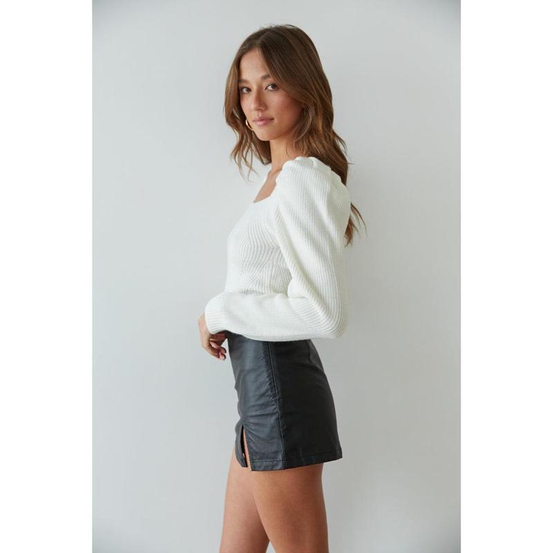 Add some sass to any outfit with the Kourt Faux Leather Mini Skort! Complete with a high rise fit, built in shorts for extra privacy, a vegan leather material, and a side slit detail for a peek of leg. Pair with a corset top to complete this edgy look!