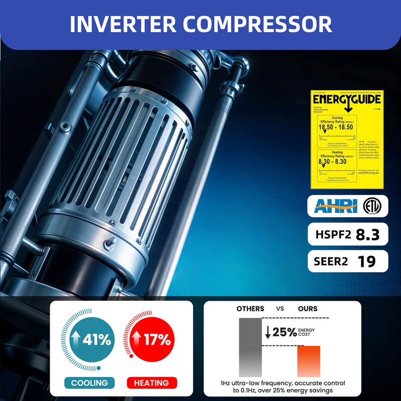 4. Energy-Efficient and Eco-Friendly Design: Engineered with a high-efficiency R32 inverter compressor and a SEER2 rating of 19, this air conditioner delivers reliable performance while consuming less energy. It operates on a standard 110V power supply and offers versatile mounting options for bedrooms, offices, and living spaces. With multiple modes and a heat pump of 0.75 tons, it provides year-round comfort with minimal environmental impact.