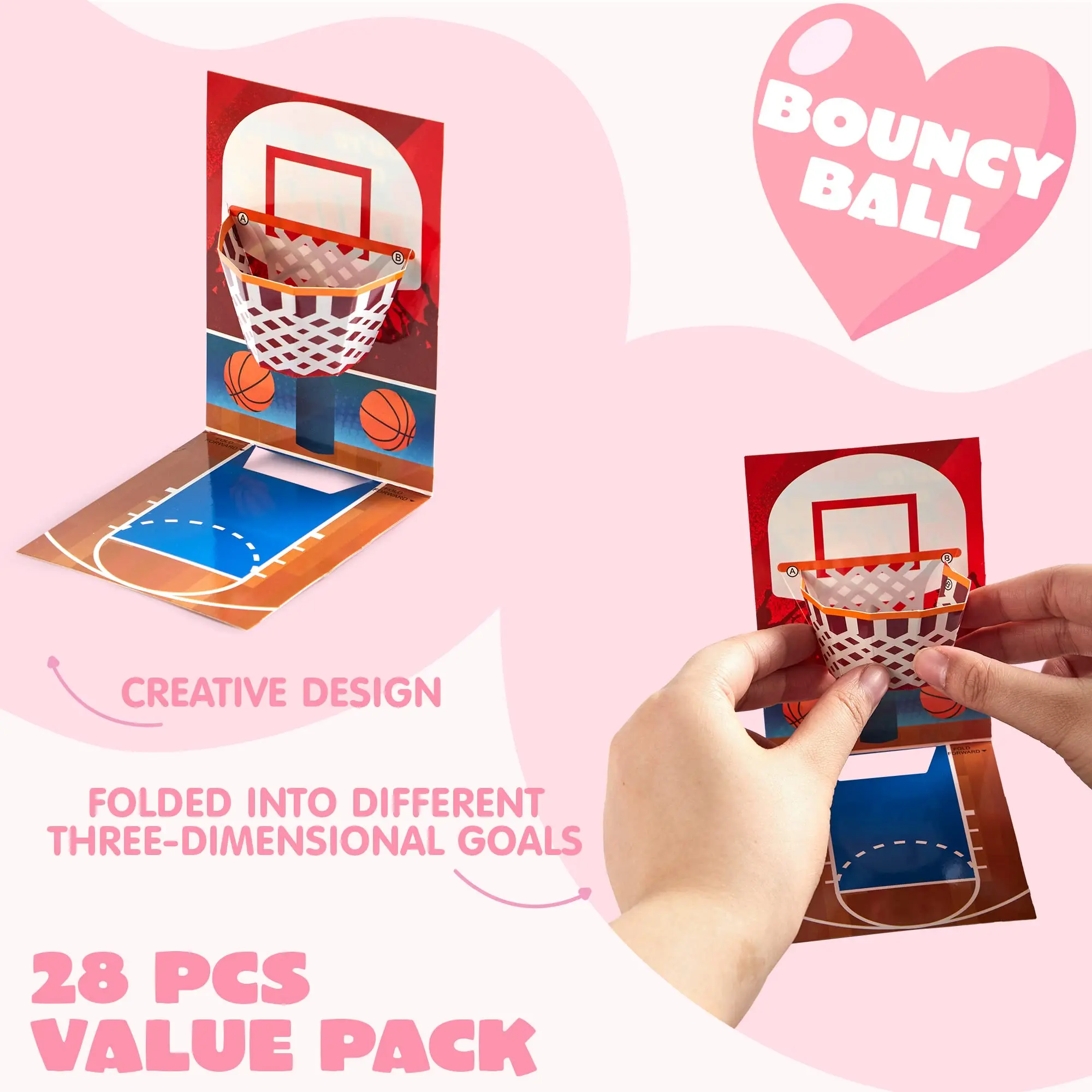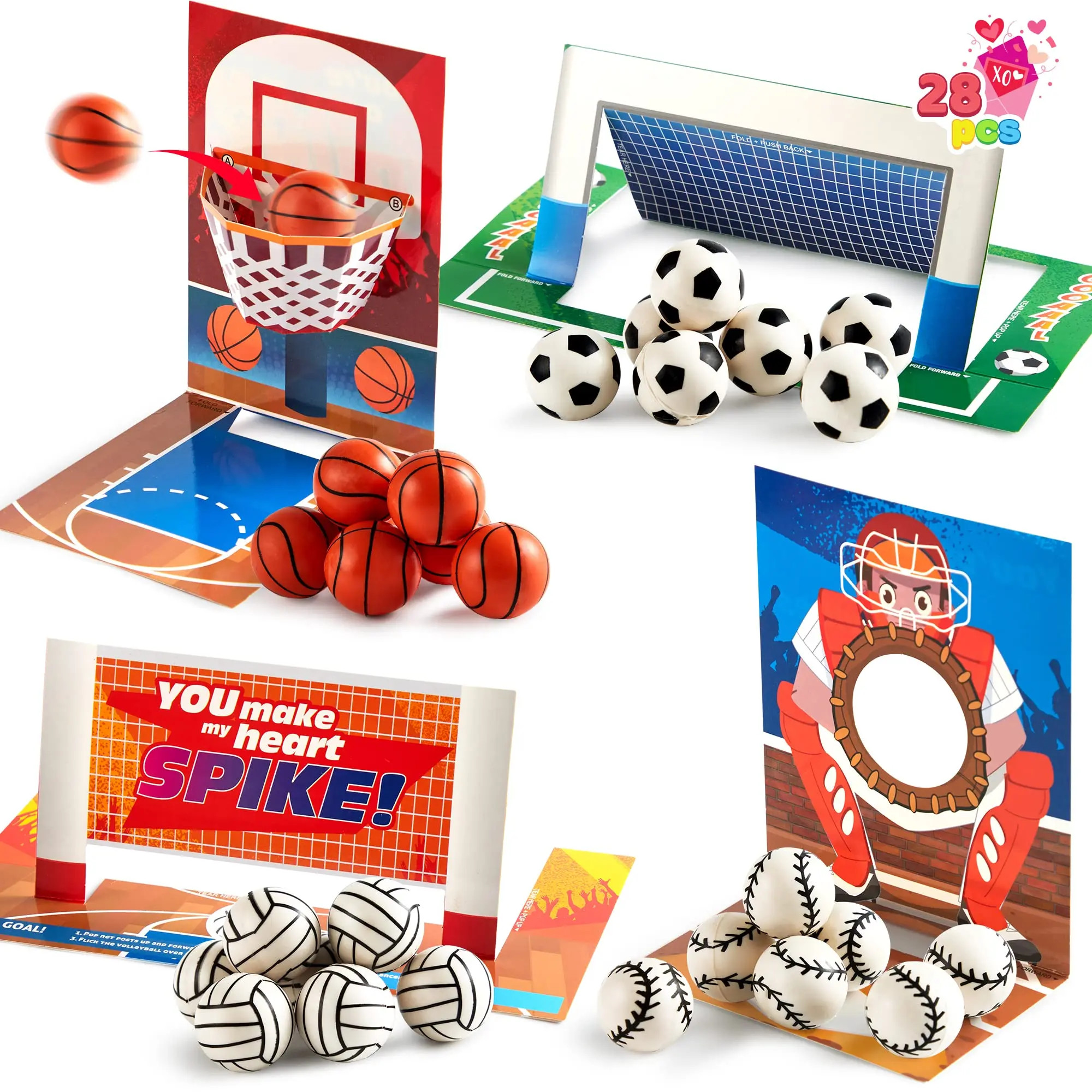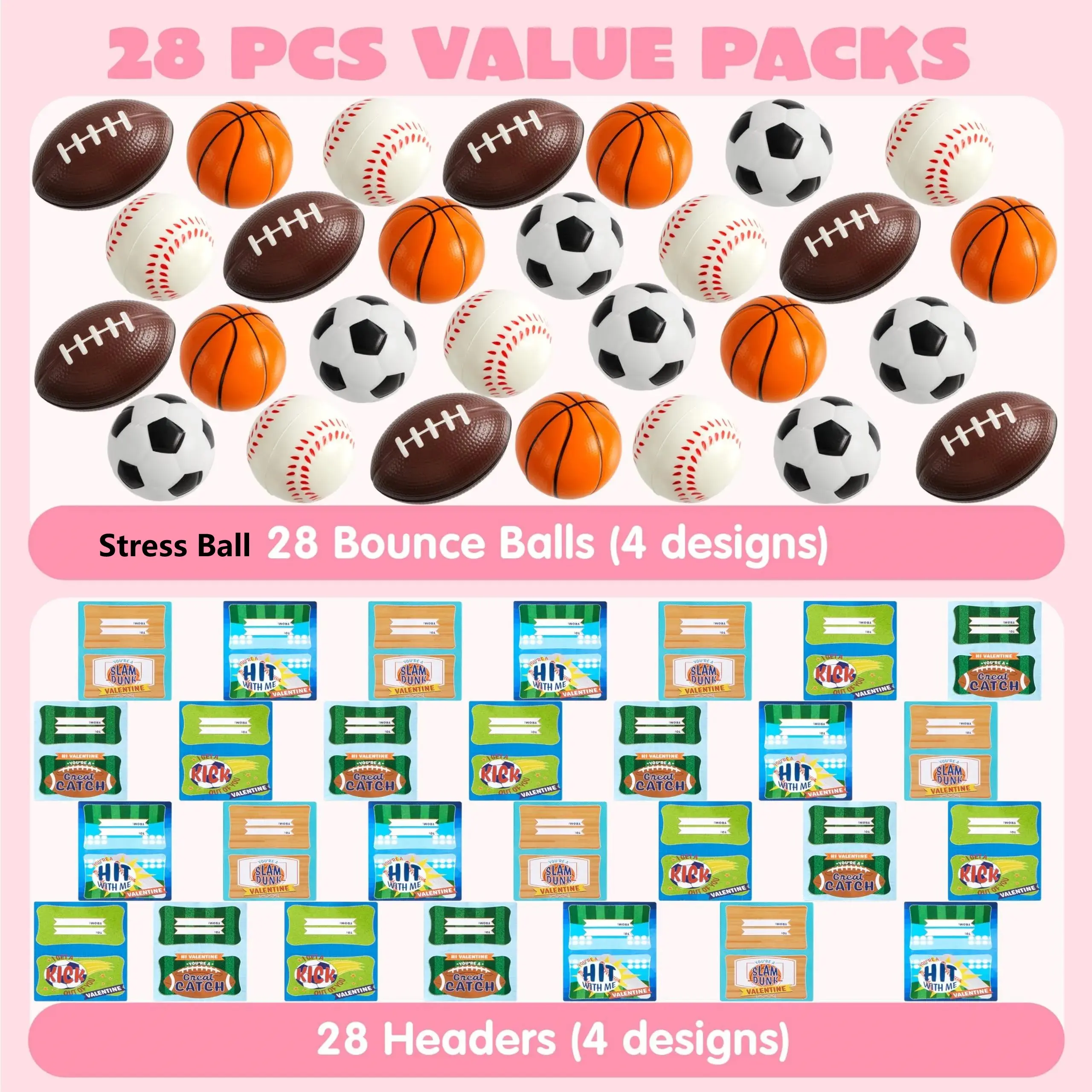 ·28Pcs Stress Balls: Our set includes 28 mini balls and 28 headers, featuring four distinct designs. Each header has a unique pattern and punchline greeting. 🎾