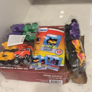 ·16 Pack Pull Back Monster Truck Toys: The valentines card has 16 cards with matching trucks, each with 4 designs. 🚛