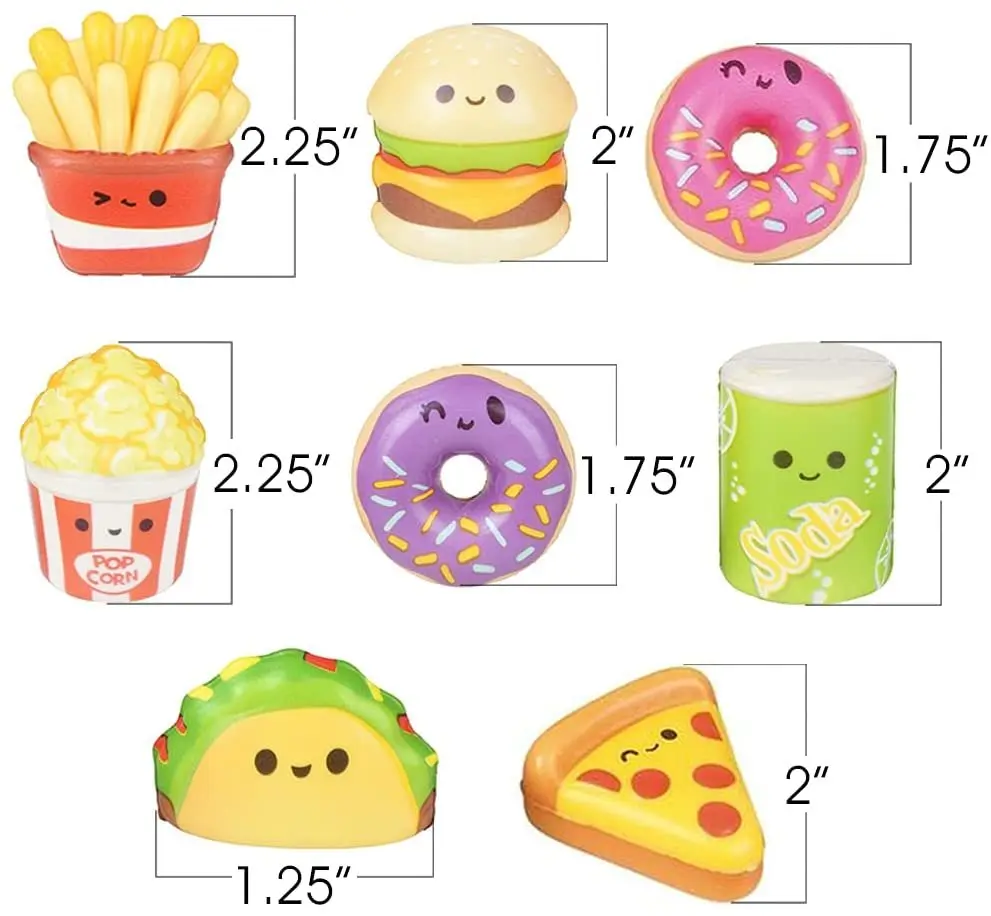 ·SIZED TO PERFECTION: The stress relief toys for kids are made of high-quality soft slow rise material and are favorably sized for your little cookie. The soda measures 2", the donuts 1.75", the fries 2.25", the hamburger 2", the pizza 2", the popcorn 2.25" and the taco 1.25".