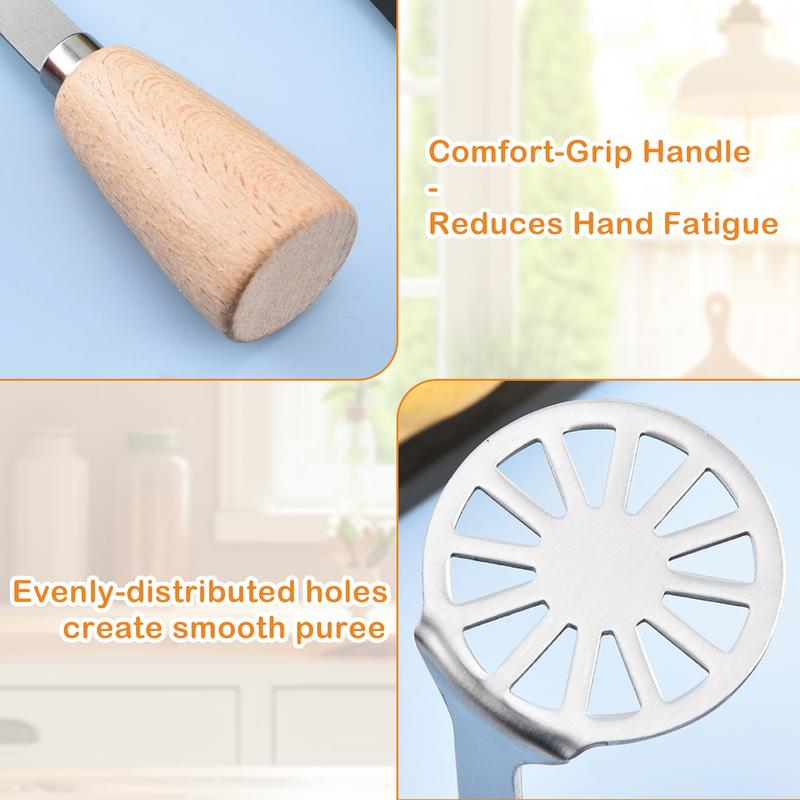 Stainless Steel Material - Our potato masher has stainless steel head design for durable and reusable. It also bright and smooth to allow you easily clean Evenly Leakage - Our potato masher is designed with evenly-distributed holes to create smooth puree, making the potato mash look delicious and delicate Comfort-Grip Design - Our potato masher has wooden non-slip handle that ensures you can grip comfortably, effectively reducing your hand fatigue