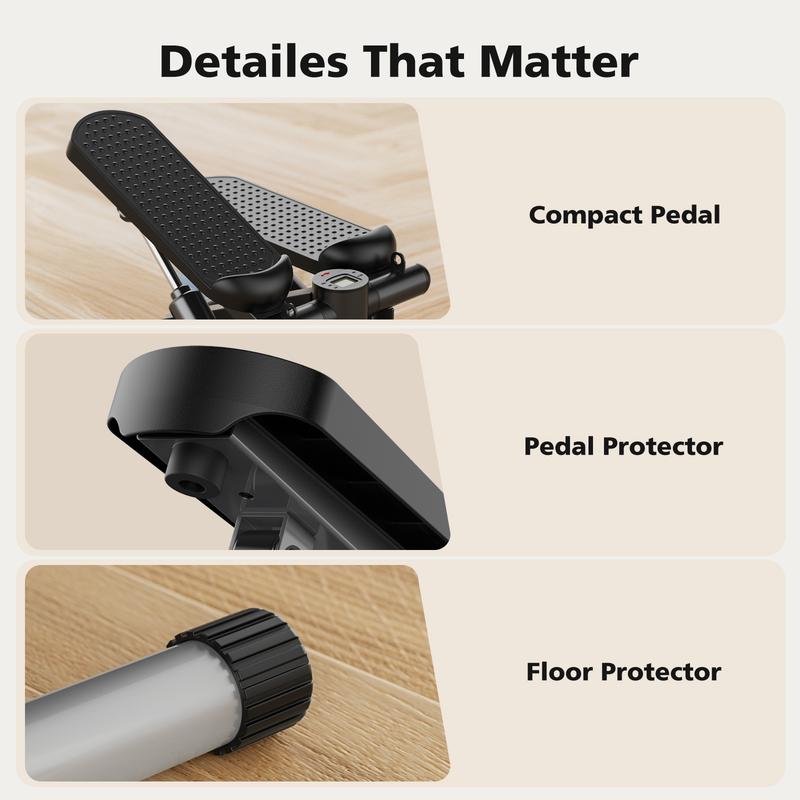 ·Works Super Quietly: This mini twist stepper with resistance bands utilizes ultra-quiet hydraulic cylinder hydraulic drive system, also there has a silent silicone cushioning pad under the foot pedals to make the stepping quiet and gentle.