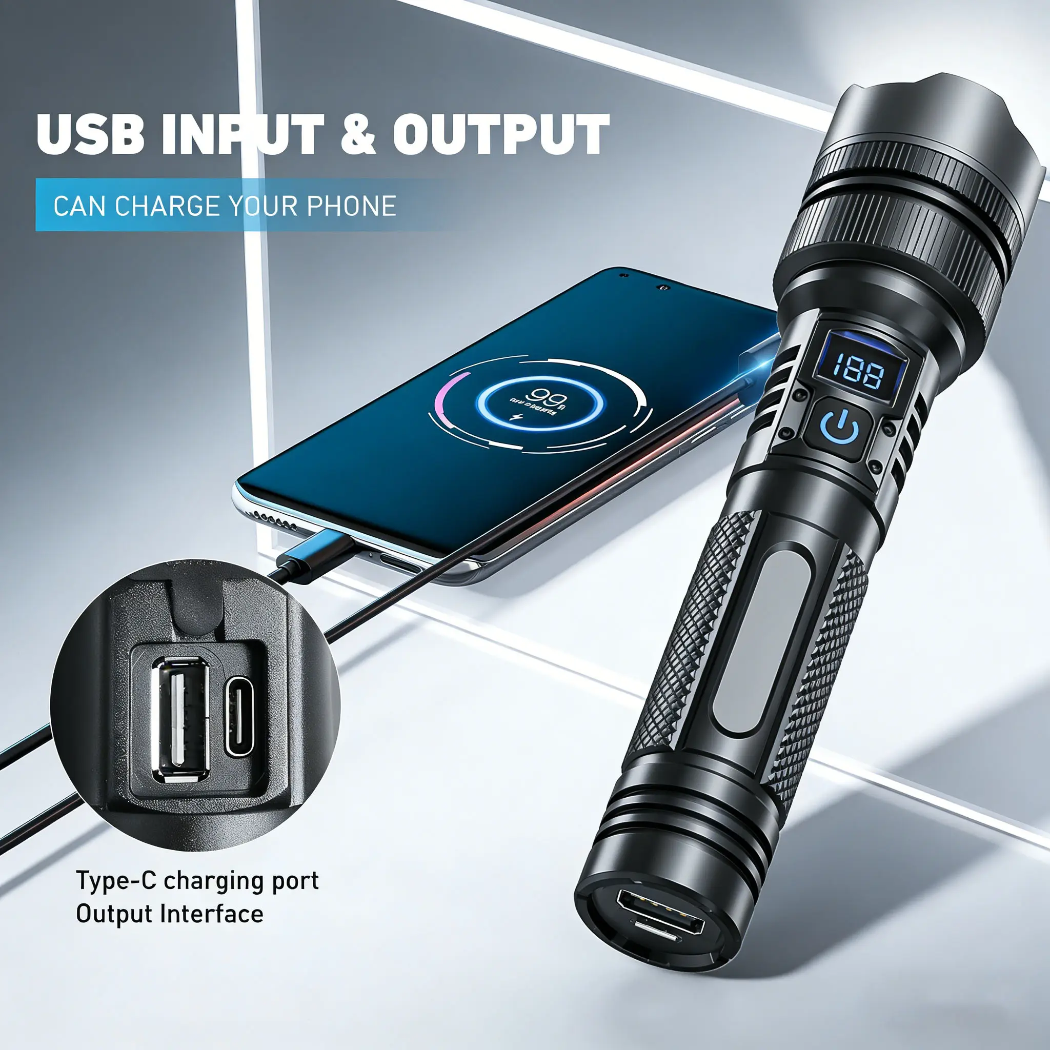 5. Mini Strong Flashlight 2000LM LED with charging Phone function Digital display of power, Rechargeable,Zoomable, , X4Waterproof, Adjustable Brightness Flash Light for Outdoor, Emergency, Camping Accessories Zoomable Rechargeable