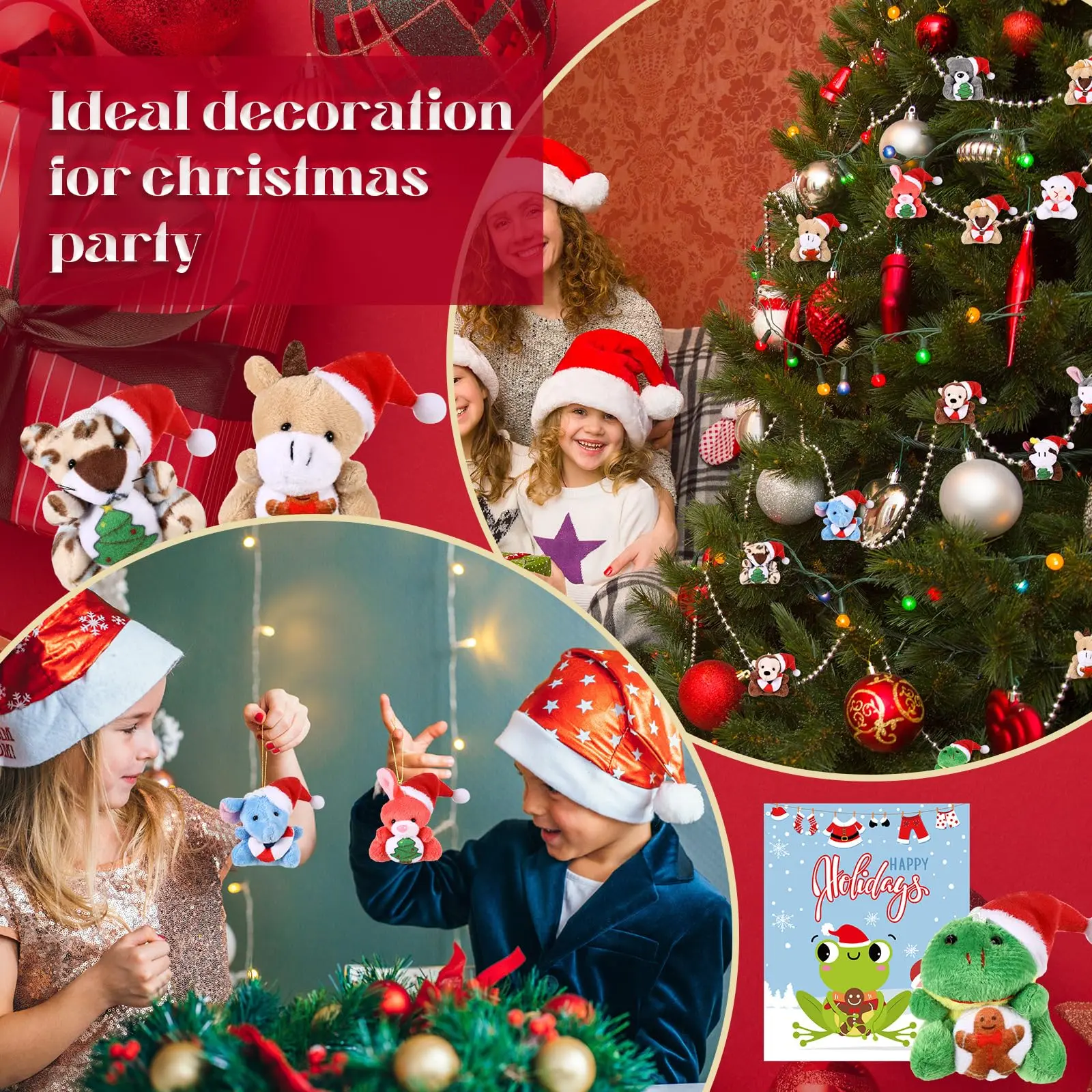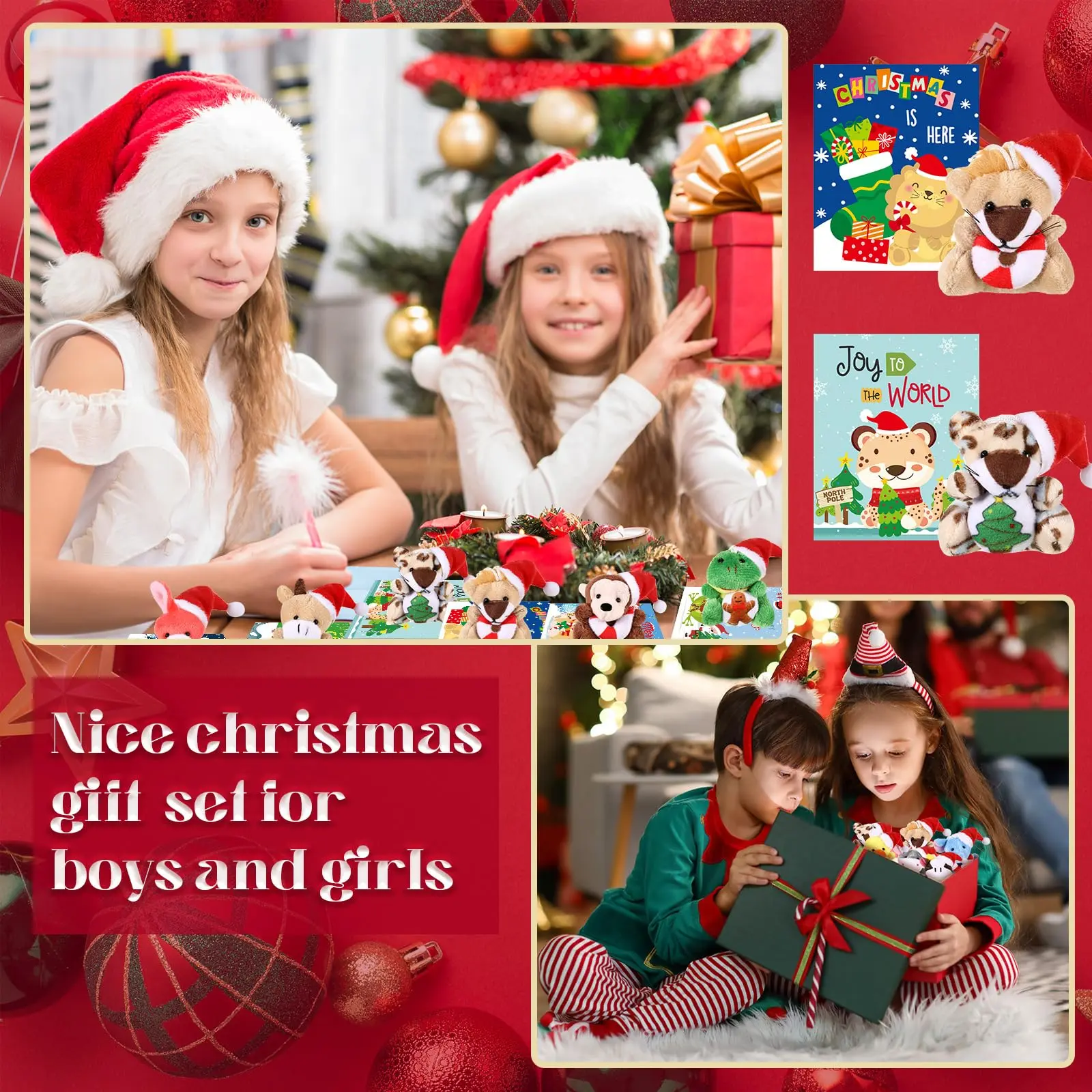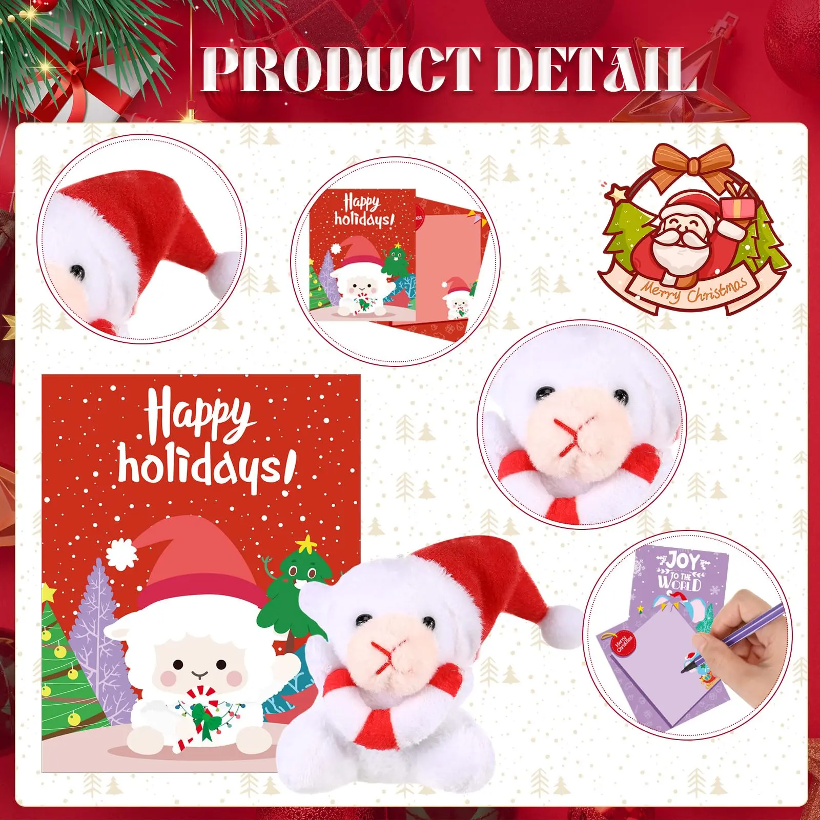 ·Charming Christmas Patterns: add a festive touch to your spaces with our charming Christmas patterns, the Christmas mini plush toys bulk come with the Christmas hats, and the cards come with Christmas patterns, breeding an atmosphere of excitement