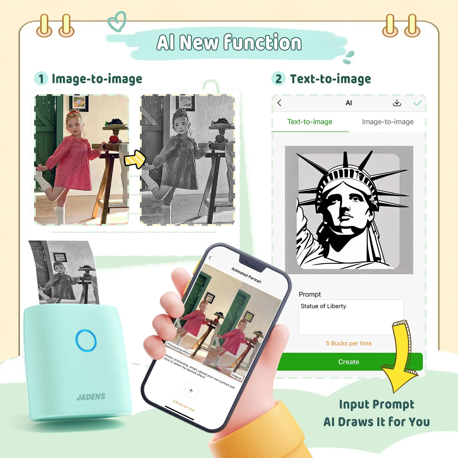 ·Mini Bluetooth Thermal Printer-Simply download the app on your phone(Android & iOS ),or iPad,enabling a seamless Bluetooth connection.The app offers a wide range of templates,graphics,themes,files,and fonts-all available at no cost.Additionally,it supports both sticky and non-sticky paper with a 2-inch width (50-56mm)