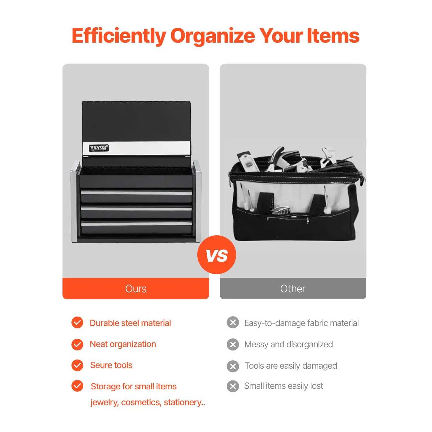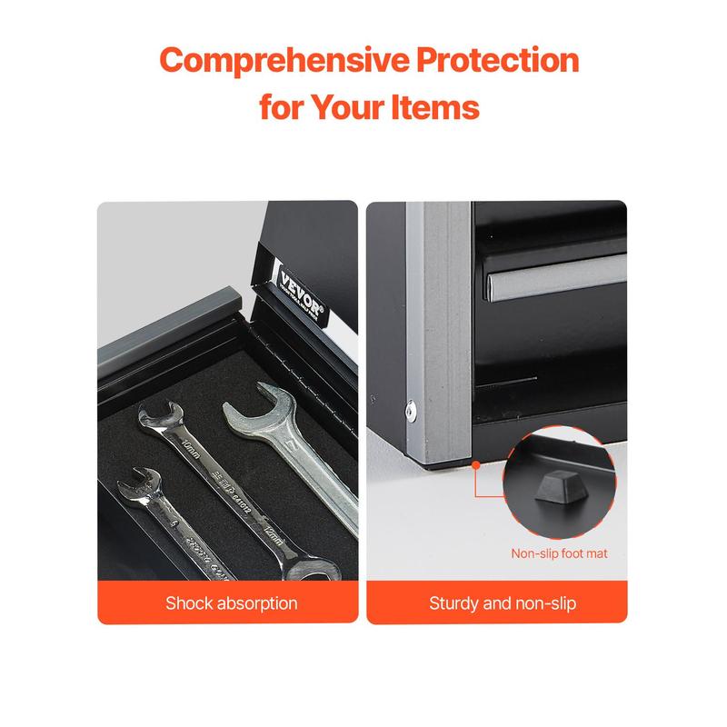 • Efficient Organization: The metal tool box is designed with multiple layers, making full use of vertical space to store more items. The top box and drawers allow you to organize different items neatly for easy access. The built-in protective padding minimizes noise from sliding or collision, providing extra protection to avoid scratches and impacts, enhancing security.