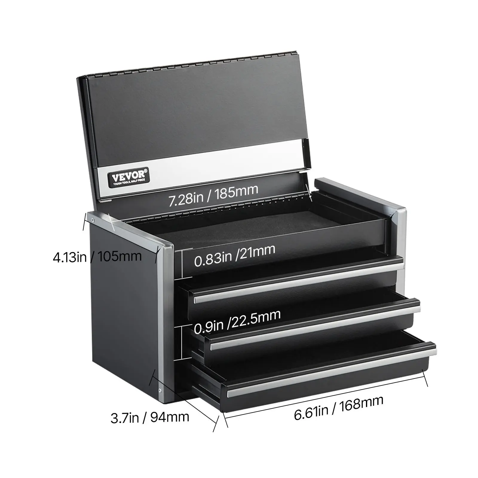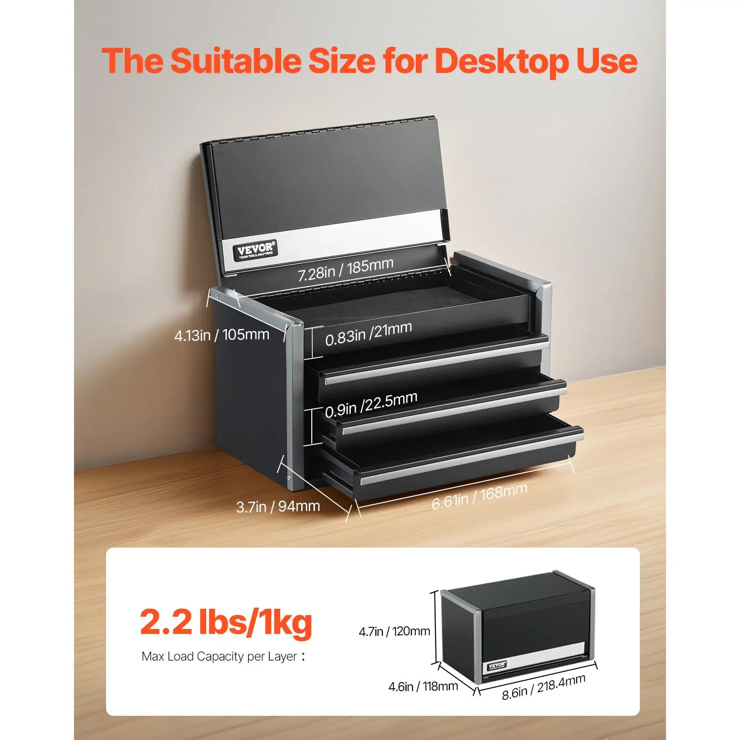 • Mini Metal Toolbox: The steel tool box measures 8.6 x 4.6 x 4.7 inches and weighs 3.36 lbs. It's compact and lightweight, making it ideal for placing on your desk as an efficient storage solution to organize various small items. It features a top box (size: 185 x 105 x 21 mm) and three drawers (size: 168 x 94 x 22.5 mm), each with a 2.2 lbs weight capacity, ensuring flexibility in storage for different small items.