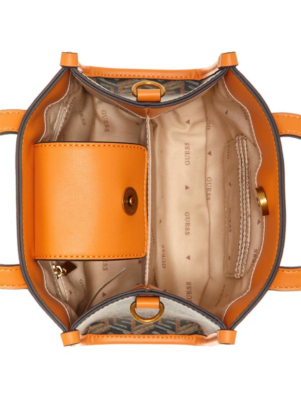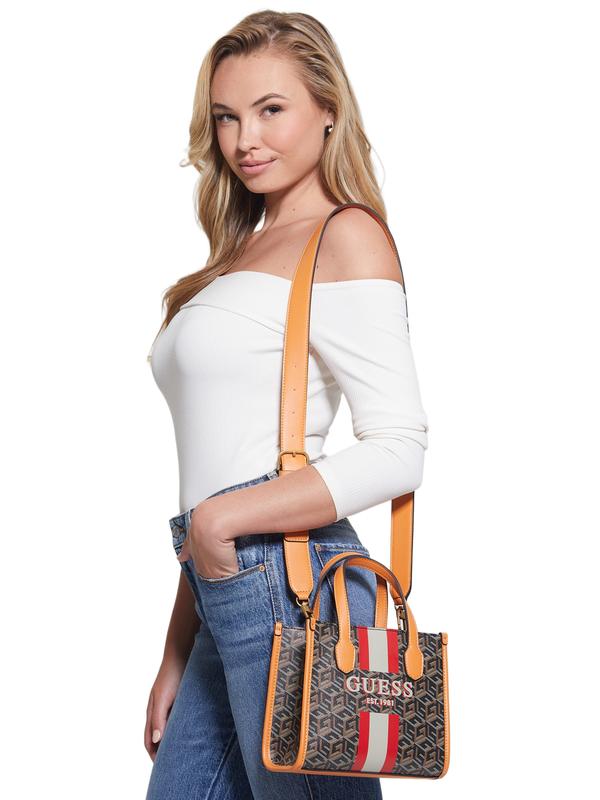 Ready to go, this faux-leather mini tote is destined to hit the streets with you. Complete with a G-cube logo print, middle stripes, top handles and a detachable and adjustable strap.