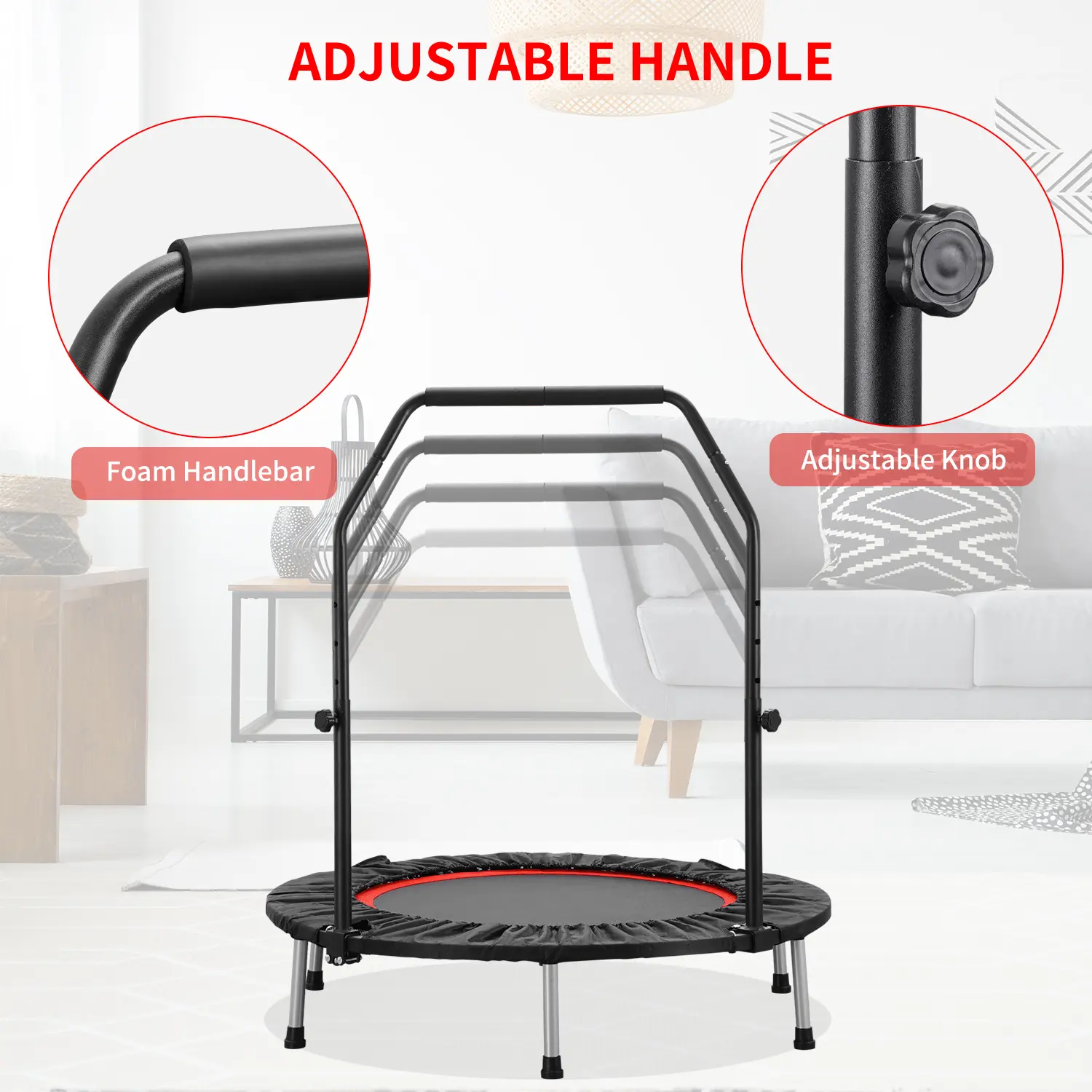 Mini Trampoline, Foldable Fitness Trampoline, Adjustable Foam Handle, Stable & Quiet Exercise Rebounder for Adults
