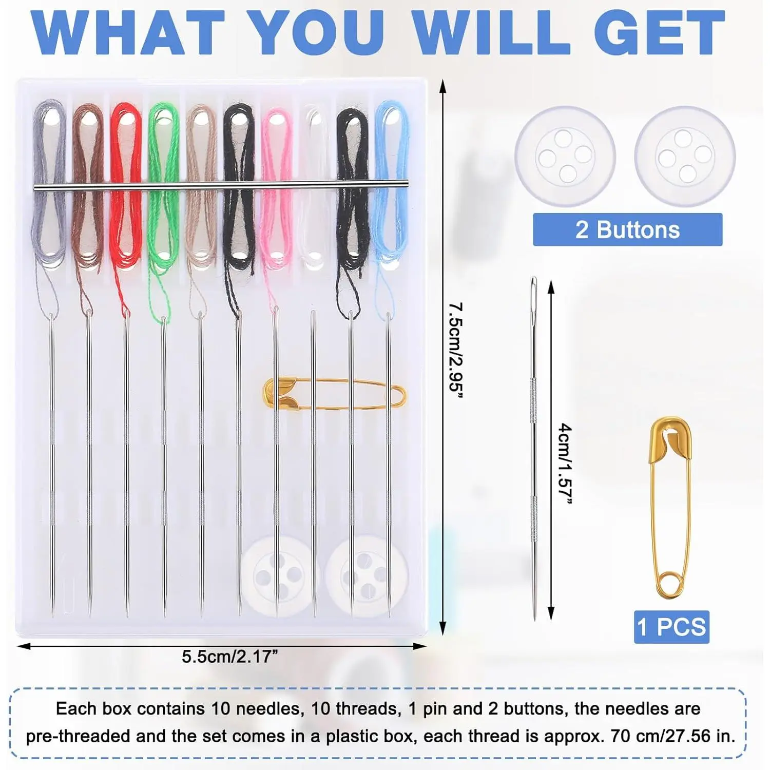 Rational Combination: you will receive 36 boxes personal sewing kits, each box includes 10 pieces needles and 10 pieces threads, 1 pin and 2 buttons, the needle is pre threaded, coming as a set in a plastic boxReliable to Apply: needles and thread kit is made of quality material, the thread is mainly made of polyester material, the length of the thread is enough for use, and not easy to break, can serve you for a relatively long timeEasy to Use: our sewing kits have been designed for easy usage, making them ideal for both professionals and beginnersThe kits are not only easy to use but also convenient to store, suitable for travel, hotels, home, office and school use, to help wherever you areFurthermore, the appropriate size ensures that you can carry them around without hassle, where you are or what you need to sew, these kits make sewing a breezeUniversal Sewing Kit: our sewing kits feature different colors of thread and sewing tools, which are ready to match most of your sewing needs, whether you are mending a tiny hole or designing a large piece of clothingThey can be applied in a broad variety of applications, from decoration and crafts to dressesWhether you are a professional or a beginner, these sewing kits are a nice solution for different sewing projectsIdeal for Travel: compact and lightweight, these sewing kits are easy to store and convenient to carry, making them a convenient resource for your travelsWhether you're jetting off on a business trip or embarking on a leisurely holiday, this set can fit effortlessly into your suitcase, ready to tackle sewing problem