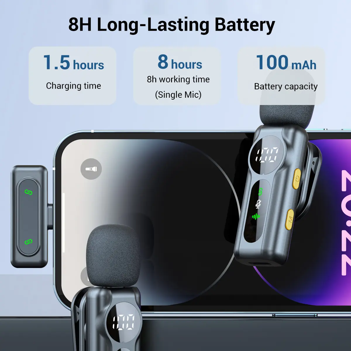 Compatible with nearly all devices—iPhones, iPads, Android phones, PCs, and laptops—this mic is super versatile. Plus, it supports USB-C connections, including the latest iPhone 15/16 models. No need to fuss with apps; just plug and play with auto pairing. Record while charging? No problem. The built-in 8-hour battery life keeps you going all day without worrying about recharging the receiver, which doesn’t need charging at all.