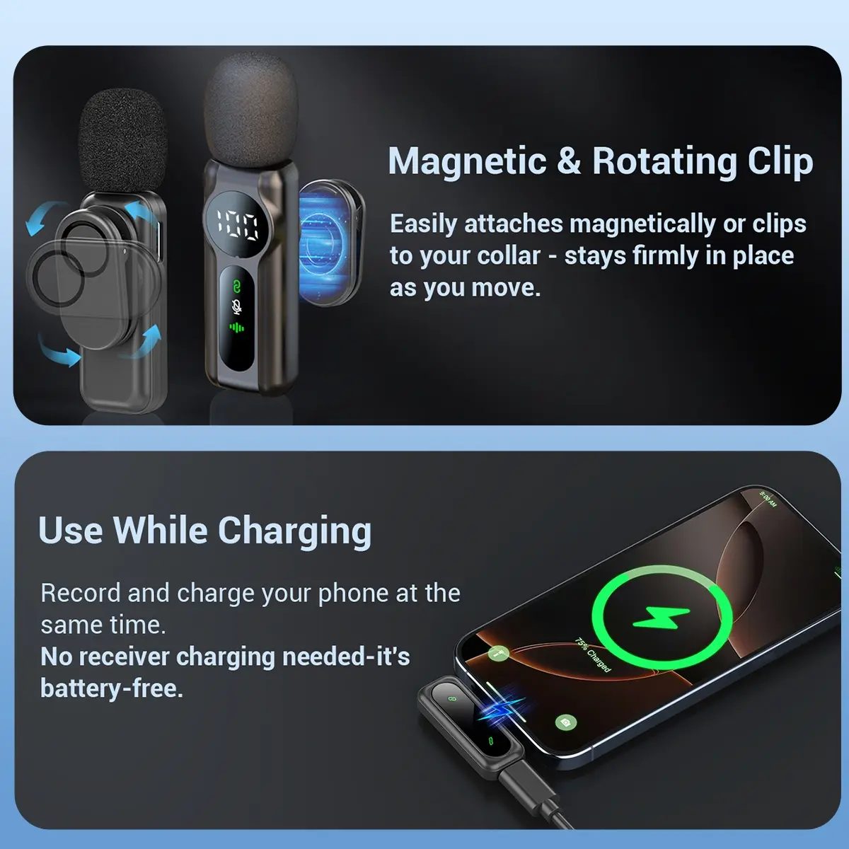 Ever struggled with noisy backgrounds ruining your vlogs or online classes? Meet your new best friend—the Mini Pro Wireless Lapel Mic. Designed for creators, teachers, and anyone on the move, this mic delivers professional-grade audio with intelligent noise cancellation, cutting out distractions so your voice shines clear and crisp. The magnetic rotating clip makes attaching it to your collar or shirt a breeze, and its compact size means it fits right in your pocket or bag.