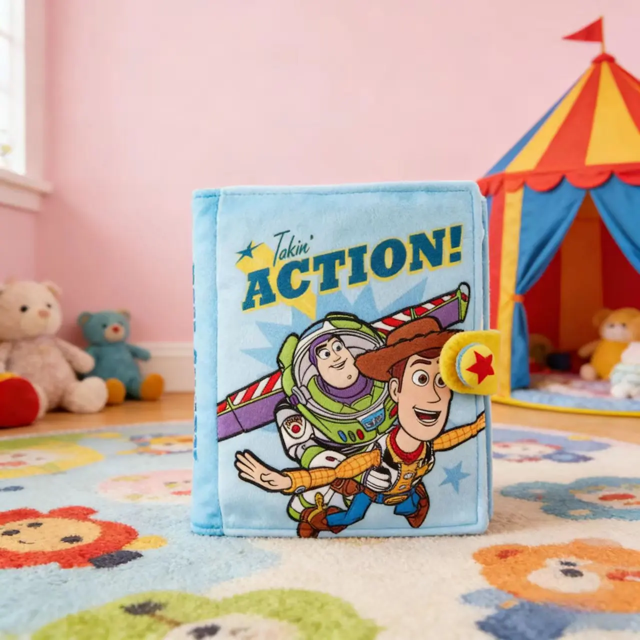 TOY STORY COMIC DESIGN – Vibrant “Takin' ACTION!” scene with Buzz & Woody in flight