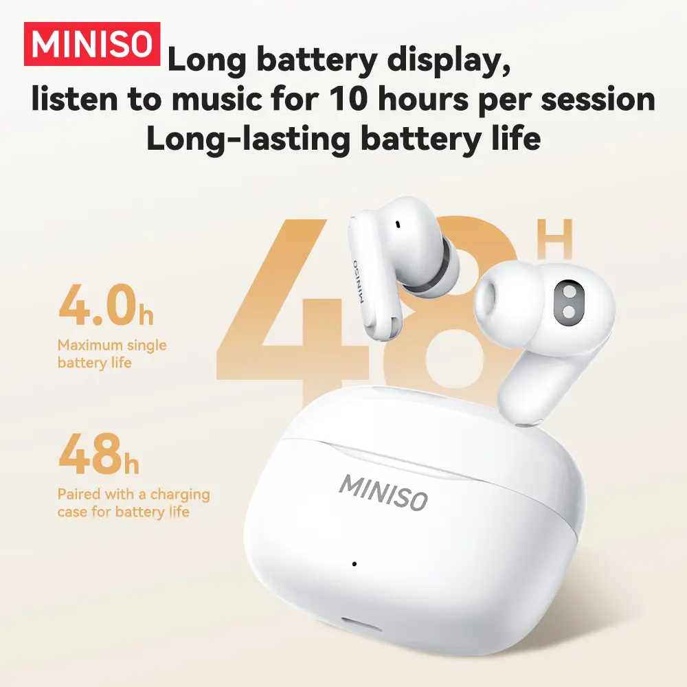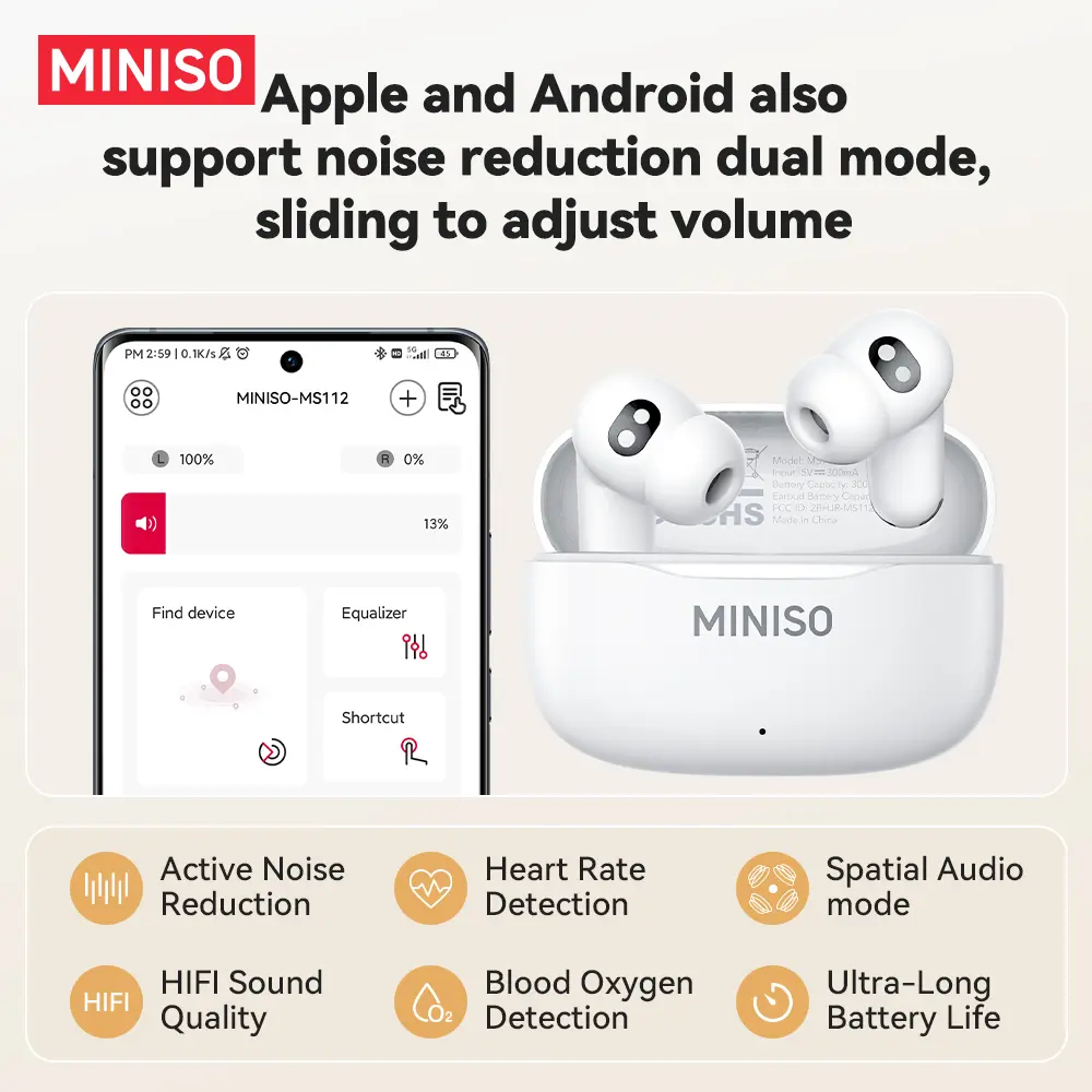 MINISO MS112 Wireless Earphones: Active noise cancellation, suitable for office, sports, studying, and audio calls, in-ear Bluetooth earphones, high-fidelity sound quality, USB-C charging.