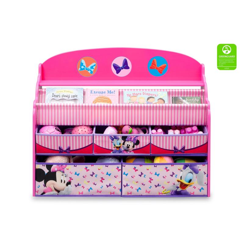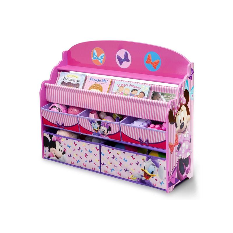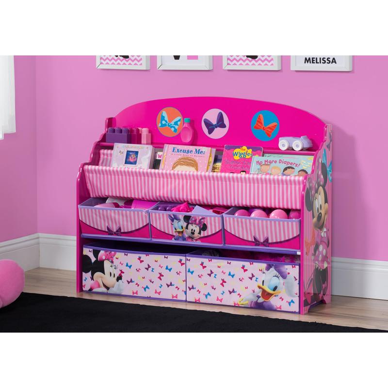Make any bedroom or play space as sweet as can be with a little help from the Minnie Mouse Deluxe Book & Toy Organizer. Boasting a bright pink finish and colorful graphics of her favorite mouse, this handy book rack and toy storage solution features five storage bins plus a bookshelf to easily hold books and toys of all sizes.