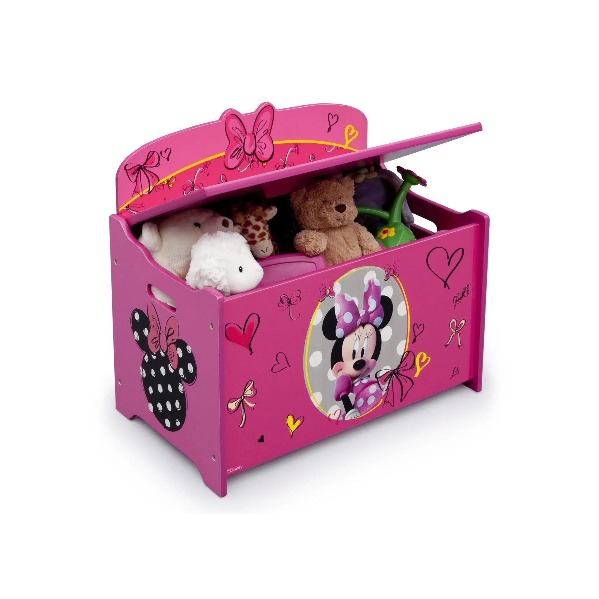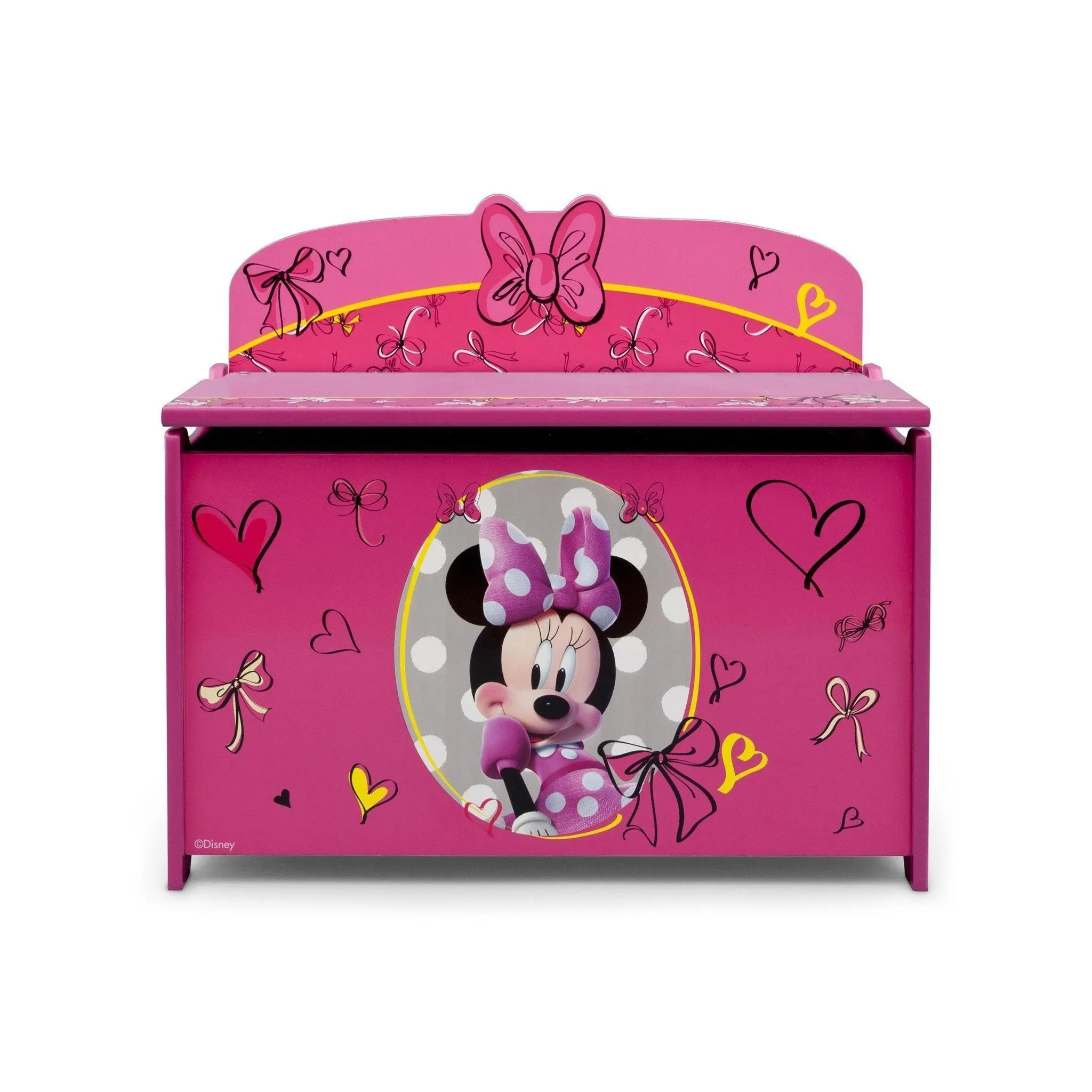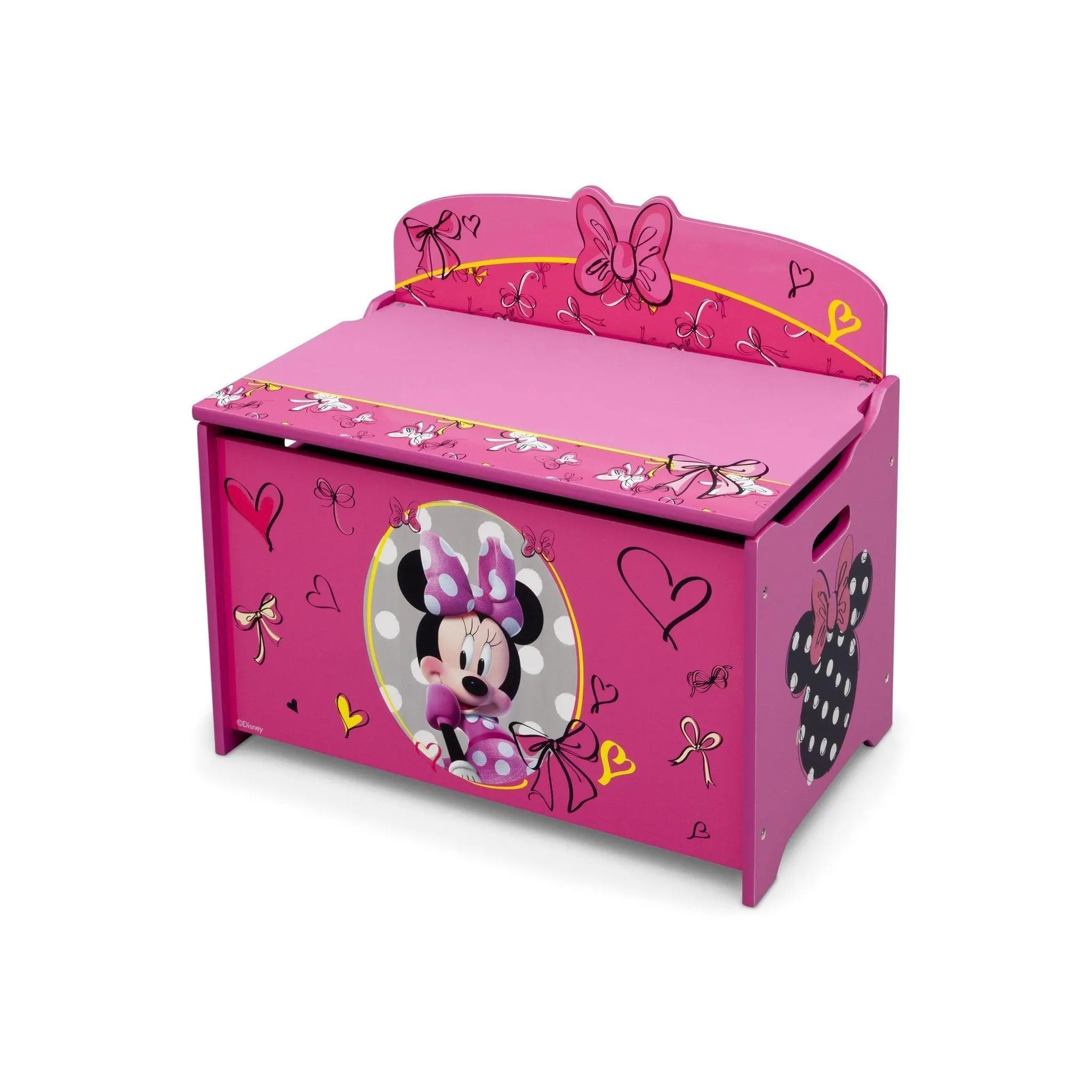 Keep her room clean with this Minnie Deluxe Toy Box from Delta Children. Featuring colorful graphics of your girl's favorite mouse, Minnie, plus durable wood construction, it's designed with rounded corners, smooth edges and a slow-closing lid for safety.