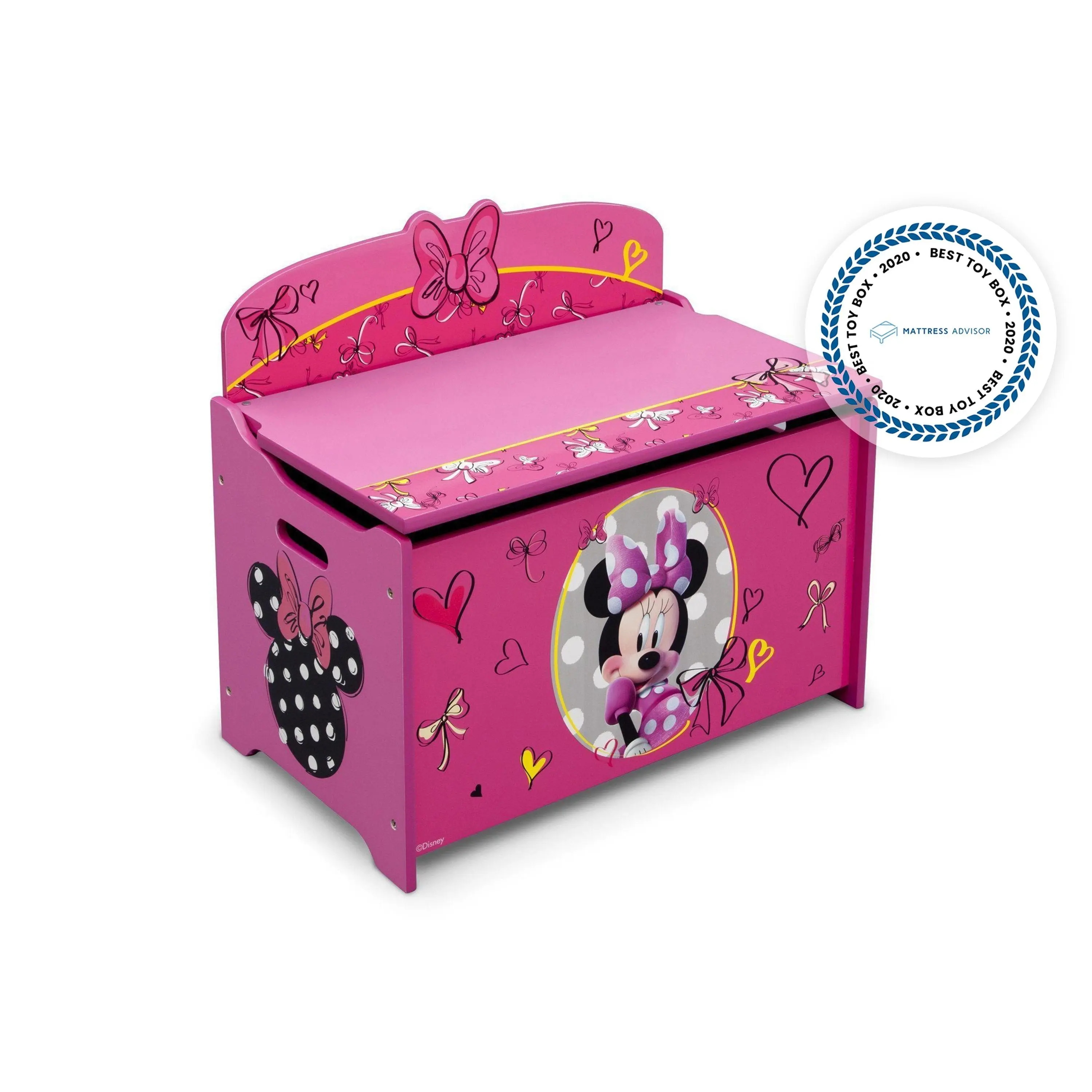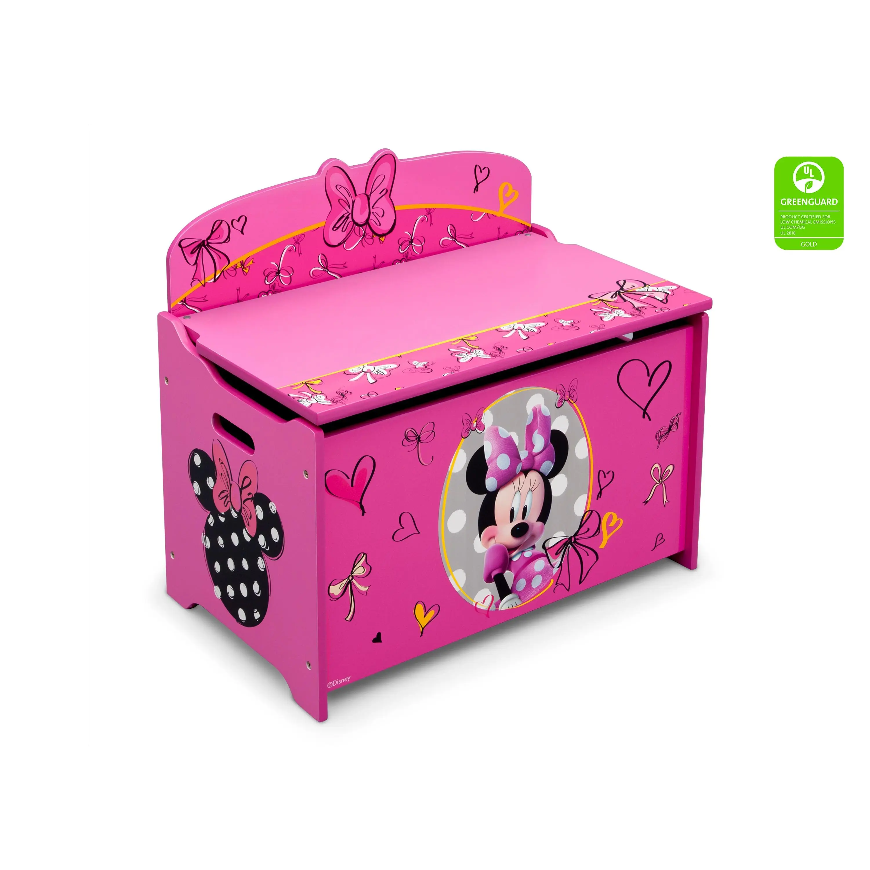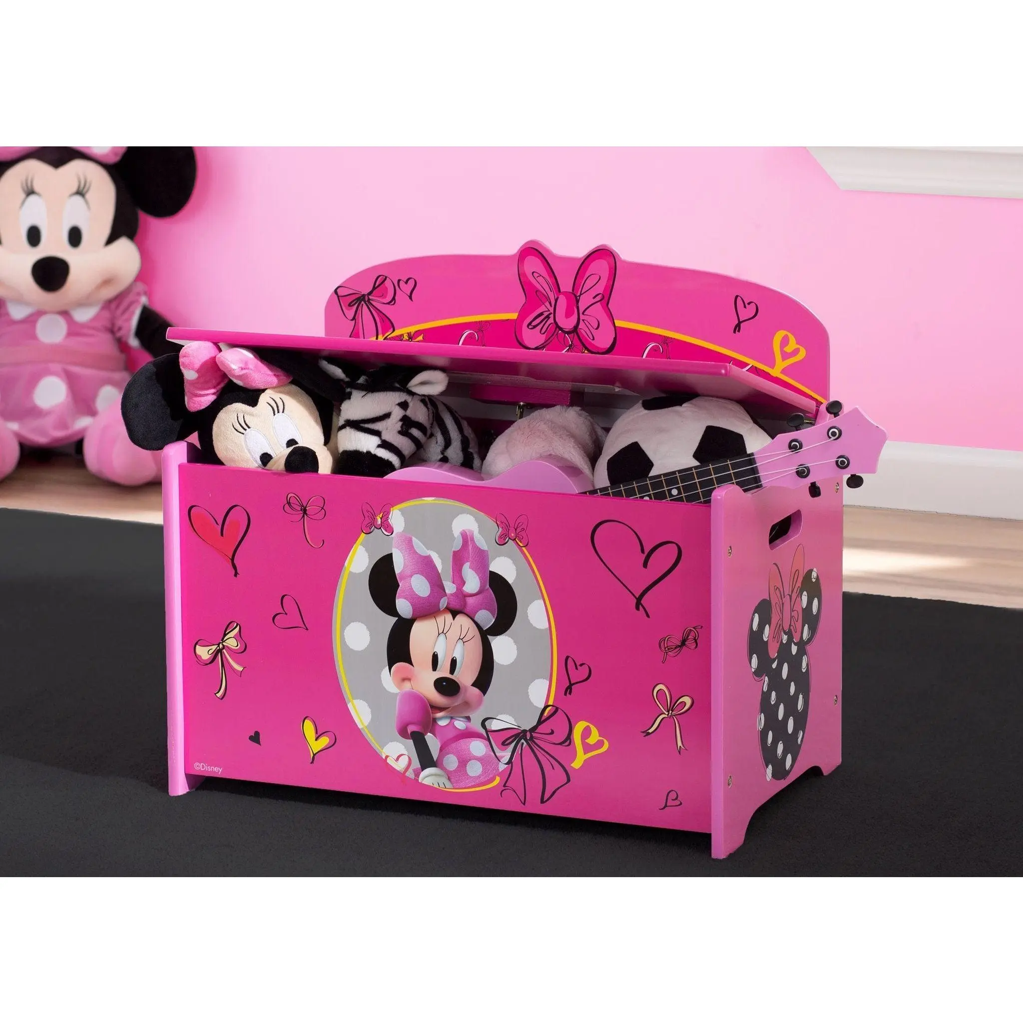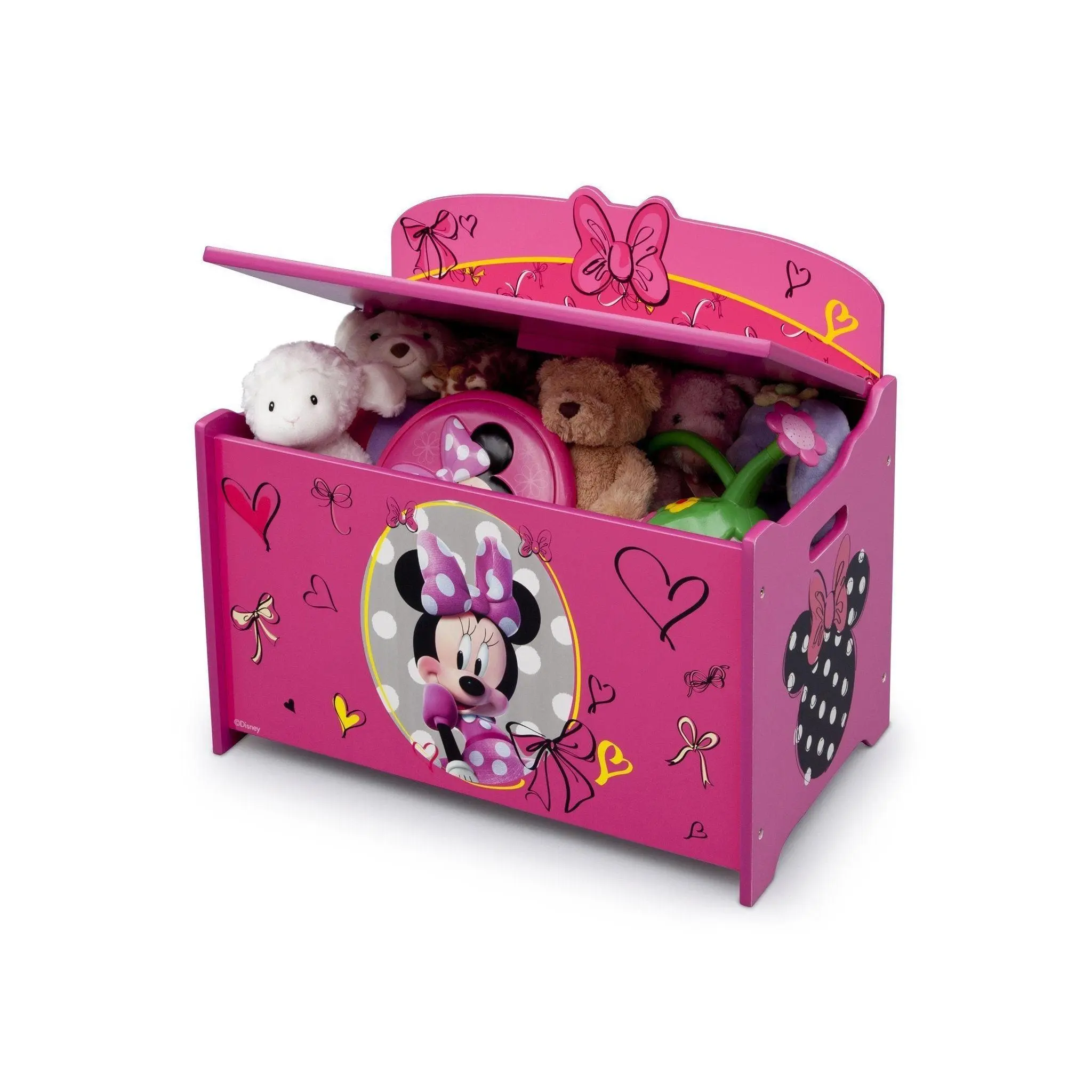 Keep her room clean with this Minnie Deluxe Toy Box from Delta Children. Featuring colorful graphics of your girl's favorite mouse, Minnie, plus durable wood construction, it's designed with rounded corners, smooth edges and a slow-closing lid for safety.