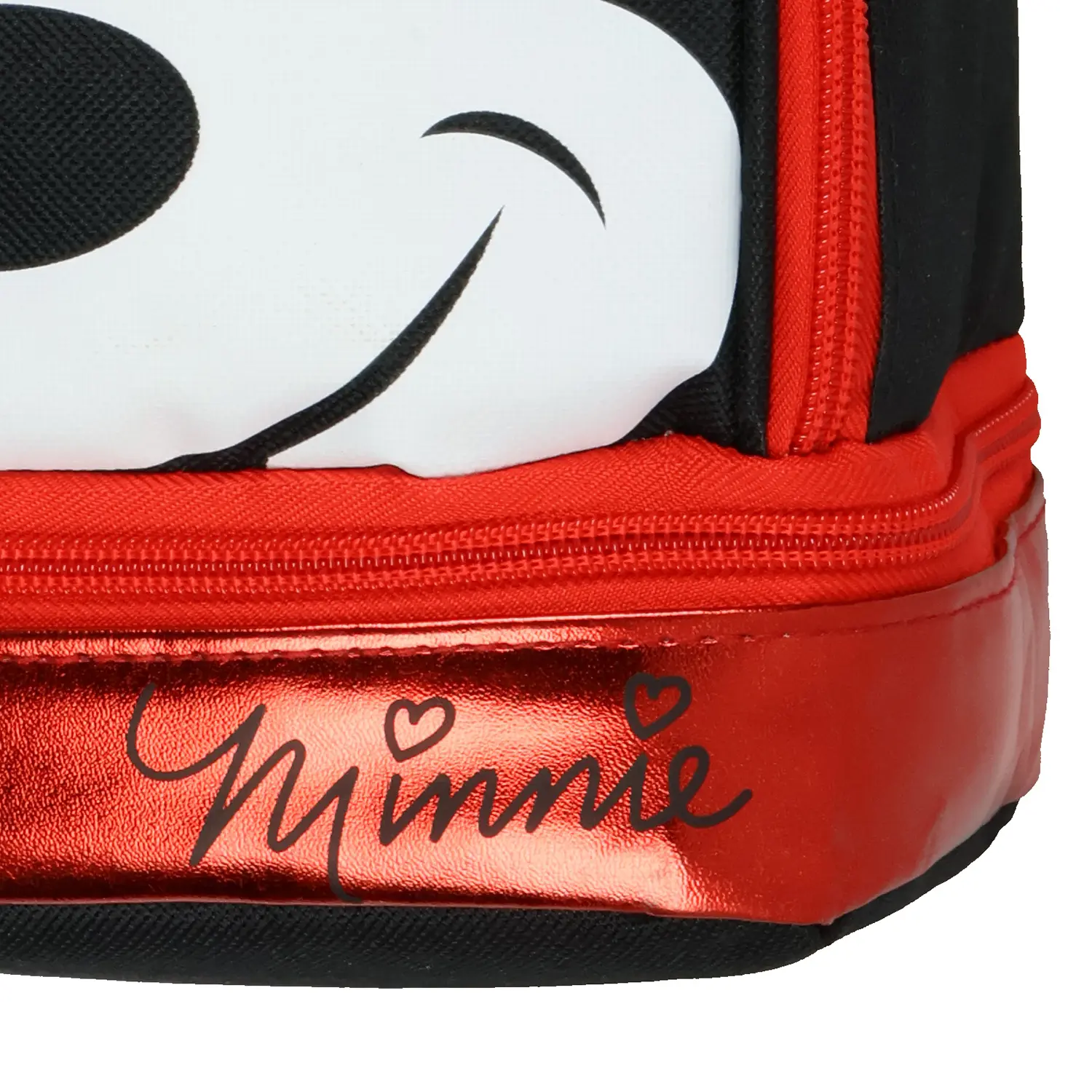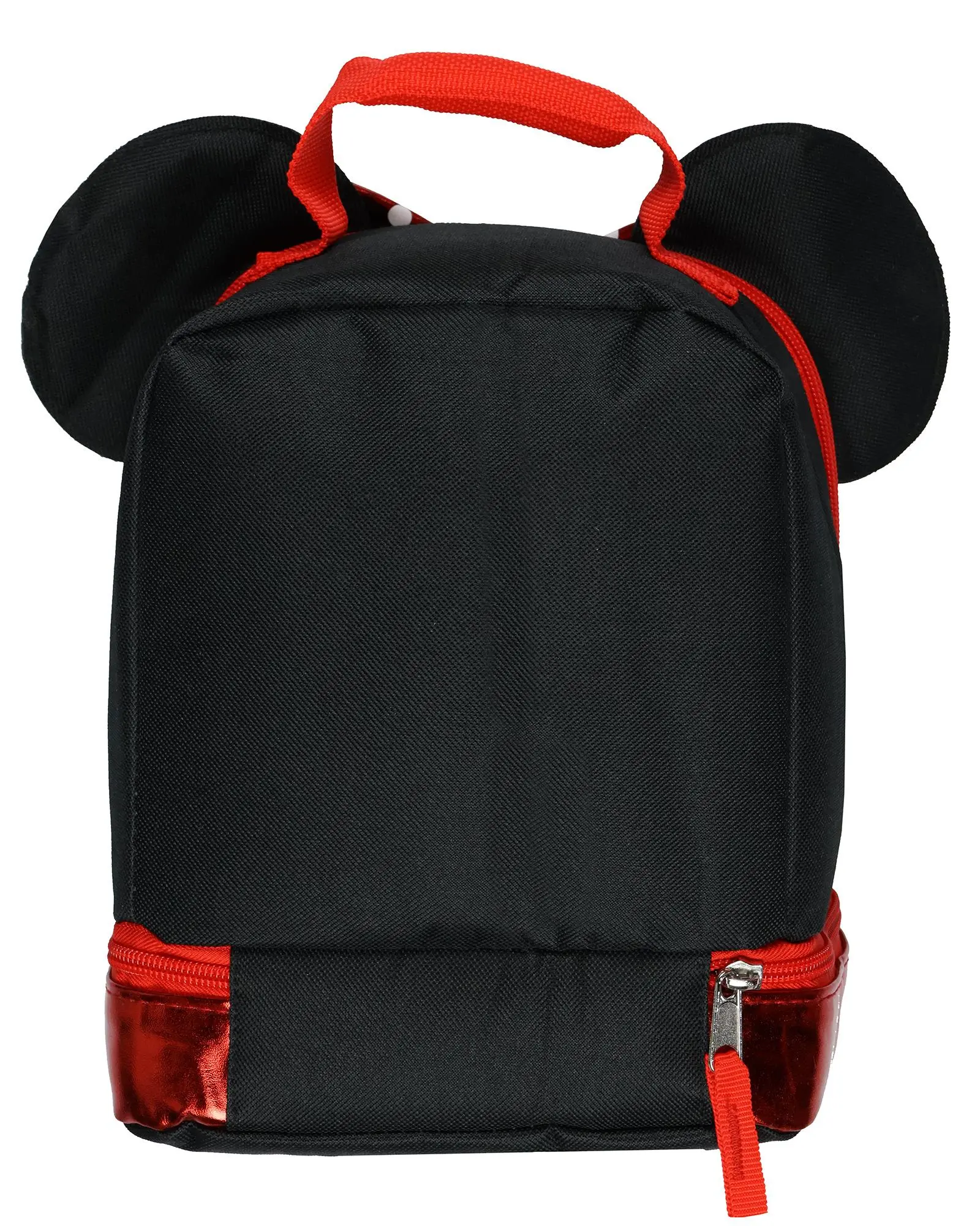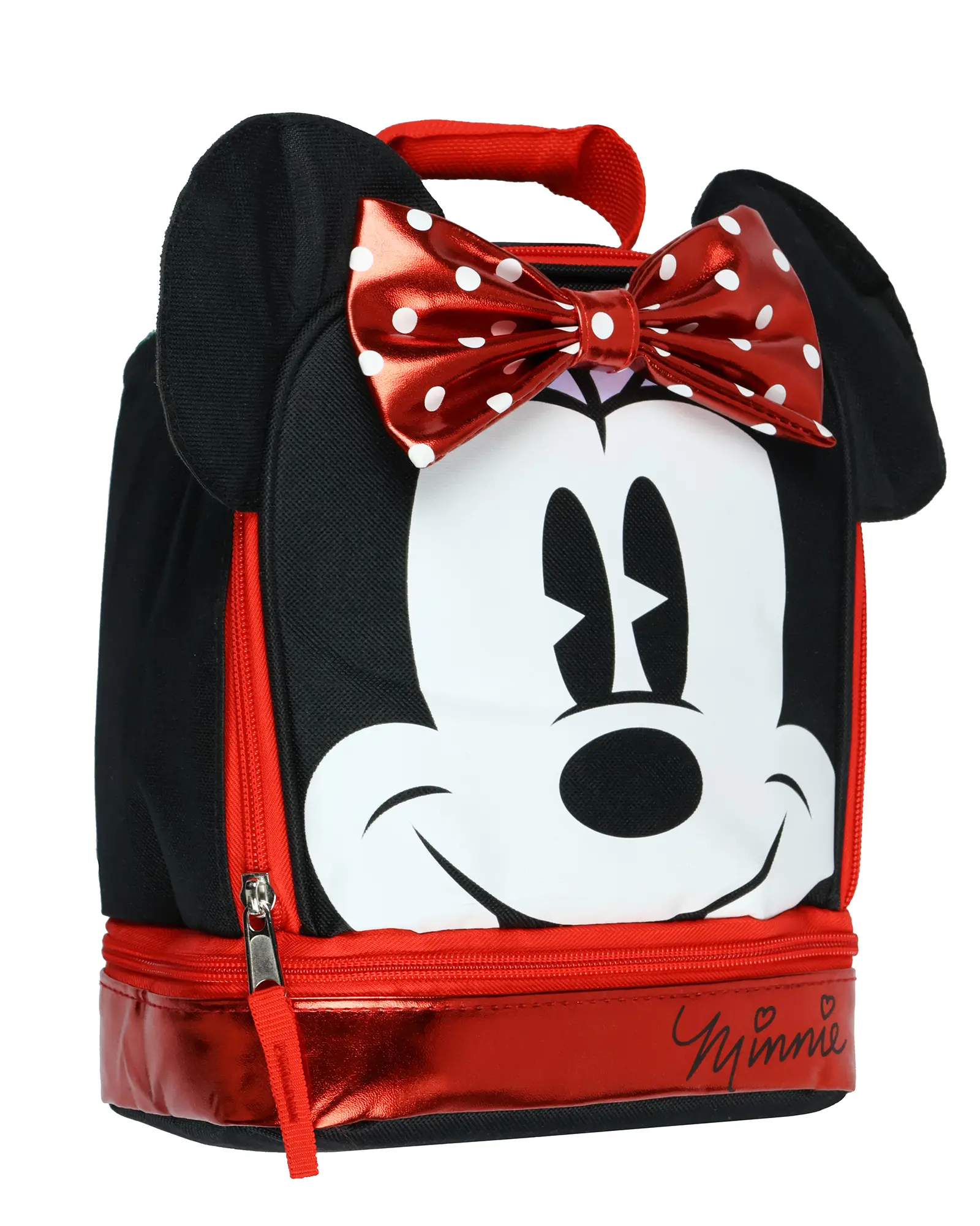 Make lunchtime magical with this Minnie Mouse 3D lunch tote! Designed with attention to detail, this adorable bag features Minnie’s signature look, complete with her classic ears and a shiny metallic red bow with polka dots. The dual-compartment design provides plenty of space for meals, snacks, and drinks, making it a great companion for school, trips, or playdates. Built for convenience, this insulated lunch bag helps keep food fresh, whether warm or cold. The sturdy top handle makes carrying a breeze. The wipeable material ensures easy cleanup, so kids can enjoy their lunch in style without the mess. Officially Licensed Product Dual-Compartment Storage: Designed for convenience, this lunch bag includes a spacious full-zip main compartment for larger meals and a separate bottom compartment for snacks, utensils, or ice packs Insulated for Hot & Cold Items: The insulated lining helps maintain the right temperature for hours, whether packing a warm meal or keeping drinks chilled. Ideal for school, daycare, road trips, or picnics, ensuring meals stay fresh and ready to enjoy Easy to Carry & Lightweight: Featuring a sturdy top handle, this lunch tote is comfortable for kids to carry on their own. This bag is compact enough that it can be placed inside a backpack as well. This lunchbox measures 10" x 8" x 4" Durable & Easy to Clean: Made from quality materials with a wipeable interior surface, this lunchbox is designed to withstand daily use while keeping its bright and fun look