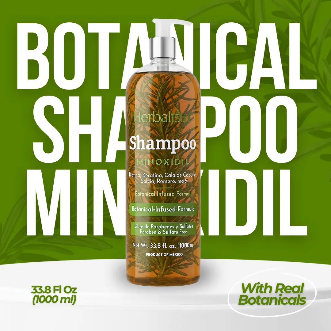 Transform your hair care today with this unique formula! Each bottle contains 1,000ML of Minoxidil 5% shampoo with added botanicals. Experience the natural benefits of Rosemary, Cinnamon, Aloe, and Mint in every wash.