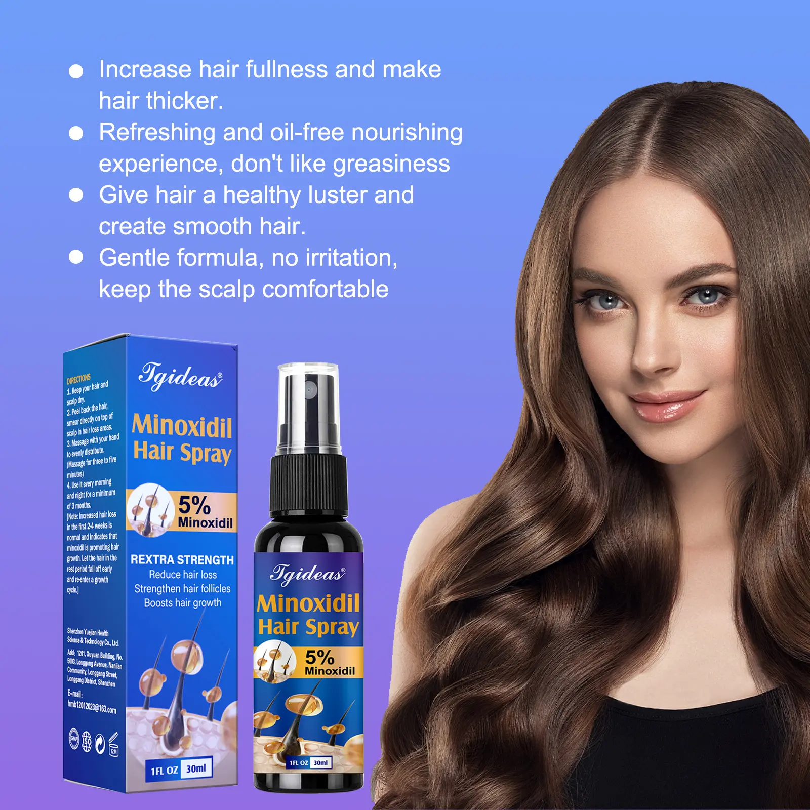 Scalp Nourishment: Infused with 5% Minoxidil, Biotin, Ginseng Extract, Vitamin H, He Shou Wu, and Angelica to hydrate and care for the scalp.