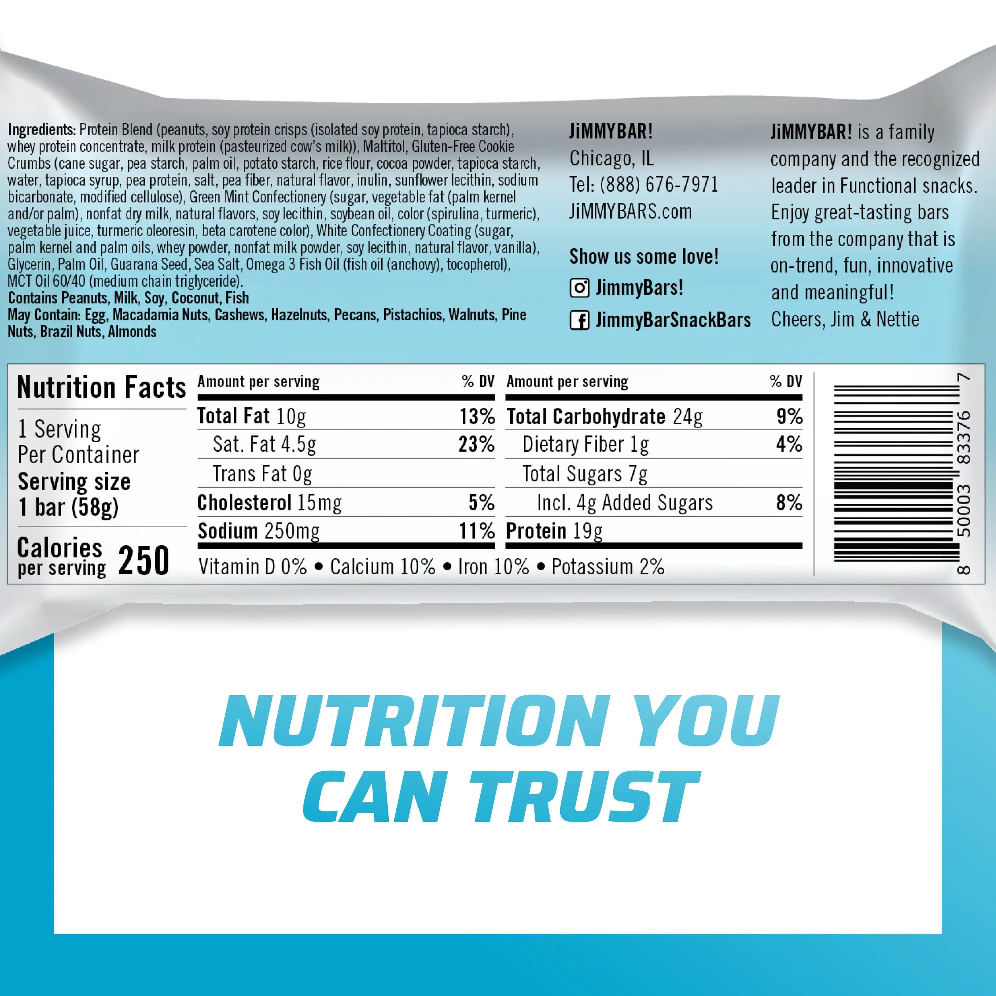 JiMMYBAR! is proud to be the only high-protein bar whose first ingredient is REAL FOOD. Our homemade peanut butter base, gluten-free cookie crumbles, and hand-drizzled chocolate coating gives you the perfect, tasty kick to power through the day. None of that artificially processed crap, just clean, functional ingredients packed with delicious taste.