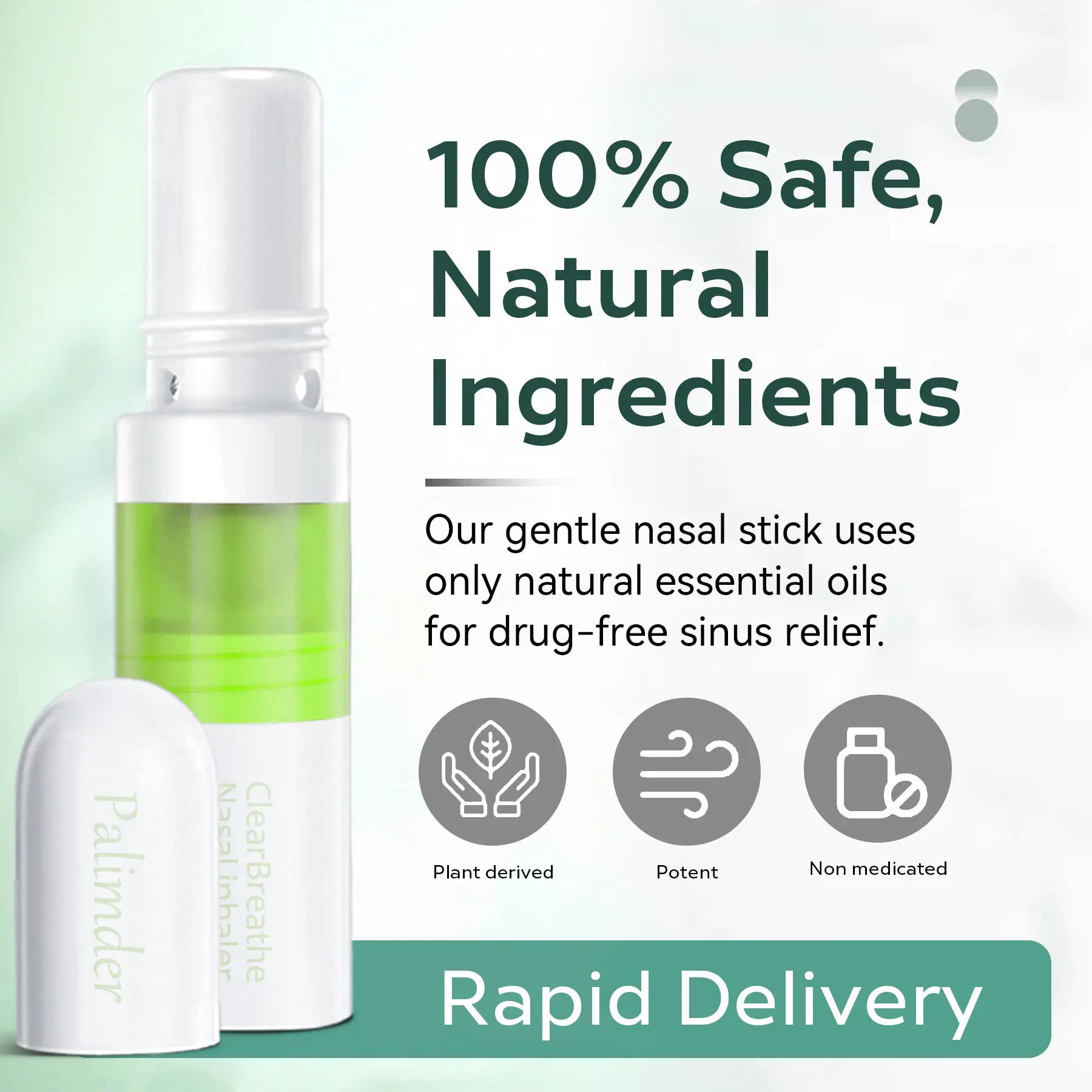 "Our gentle nasal stick uses only natural essential oils for drug-free sinus relief. This safe, non-medicated formula contains no harsh chemicals - just pure, soothing comfort you can use as often as needed for continuous nasal support."
