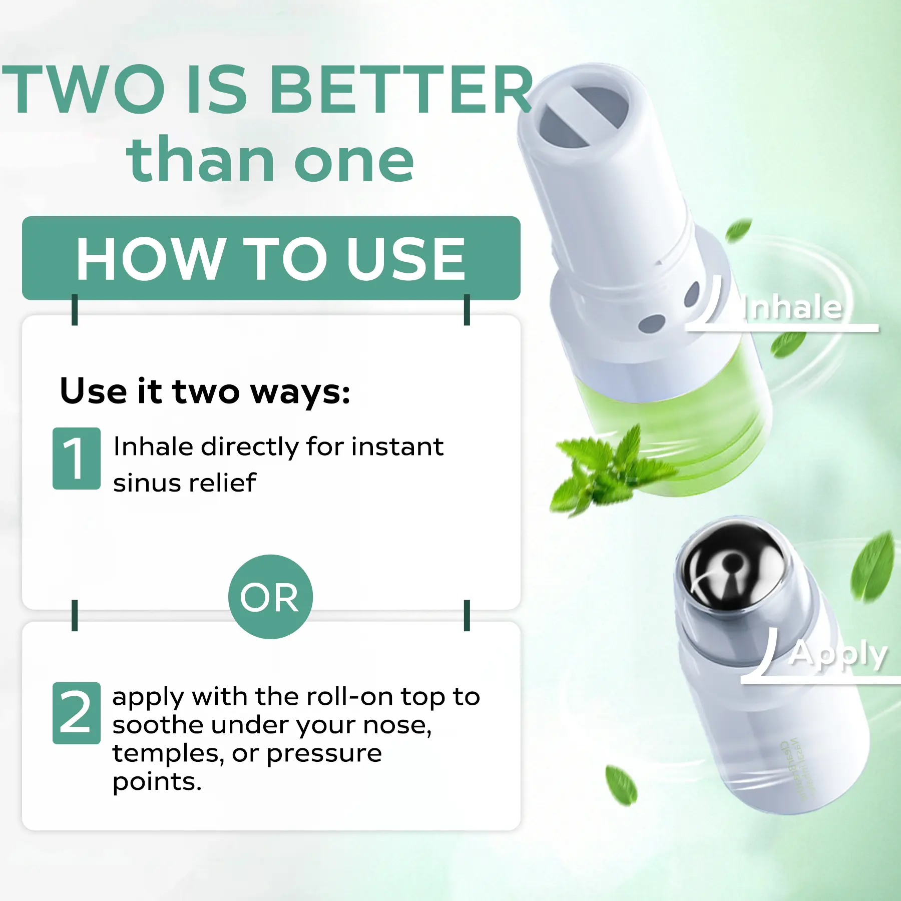 "Use it two ways: Inhale directly for instant sinus relief or apply with the roll-on top to soothe under your nose, temples, or pressure points.