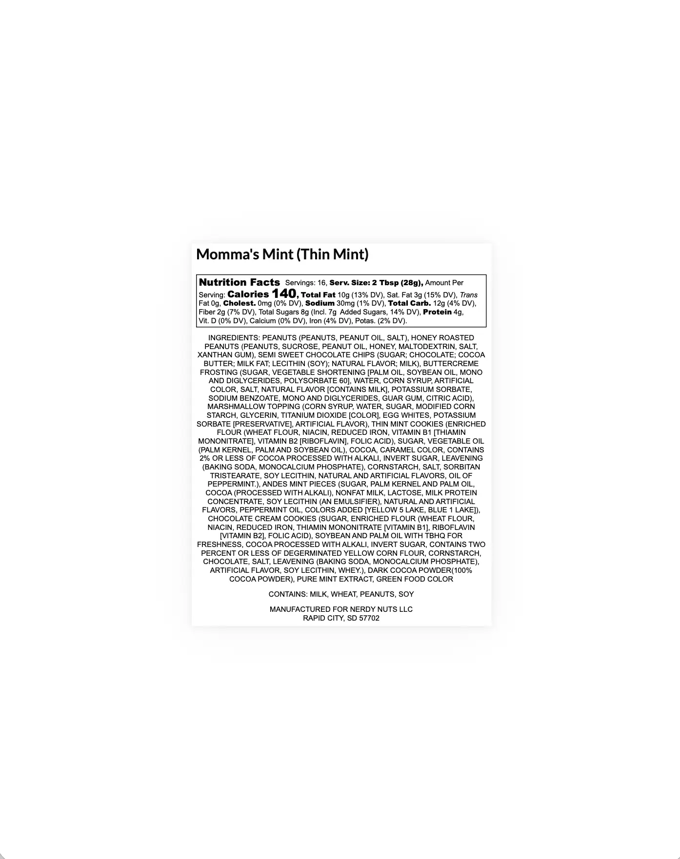 INGREDIENTS: PEANUTS (PEANUTS, PEANUT OIL, SALT), HONEY ROASTED PEANUTS (PEANUTS, SUCROSE, PEANUT OIL, HONEY, MALTODEXTRIN, SALT, XANTHAN GUM), SEMI SWEET CHOCOLATE CHIPS (SUGAR; CHOCOLATE; COCOA BUTTER; MILK FAT; LECITHIN (SOY); NATURAL FLAVOR; MILK), BUTTERCREME FROSTING (SUGAR, VEGETABLE SHORTENING [PALM OIL, SOYBEAN OIL, MONO AND DIGLYCERIDES, POLYSORBATE 60], WATER, CORN SYRUP, ARTIFICIAL COLOR, SALT, NATURAL FLAVOR [CONTAINS MILK], POTASSIUM SORBATE, SODIUM BENZOATE, MONO AND DIGLYCERIDES, GUAR GUM, CITRIC ACID), MARSHMALLOW TOPPING (CORN SYRUP, WATER, SUGAR, MODIFIED CORN STARCH, GLYCERIN, TITANIUM DIOXIDE [COLOR], EGG WHITES, POTASSIUM SORBATE [PRESERVATIVE], ARTIFICIAL FLAVOR), THIN MINT COOKIES (ENRICHED FLOUR (WHEAT FLOUR, NIACIN, REDUCED IRON, VITAMIN B1 [THIAMIN MONONITRATE], VITAMIN B2 [RIBOFLAVIN], FOLIC ACID), SUGAR, VEGETABLE OIL (PALM KERNEL, PALM AND SOYBEAN OIL), COCOA, CARAMEL COLOR, CONTAINS 2% OR LESS OF COCOA PROCESSED WITH ALKALI, INVERT SUGAR, LEAVENING (BAKING SODA, MONOCALCIUM PHOSPHATE), CORNSTARCH, SALT, SORBITAN TRISTEARATE, SOY LECITHIN, NATURAL AND ARTIFICIAL FLAVORS, OIL OF PEPPERMINT.), ANDES MINT PIECES (SUGAR, PALM KERNEL AND PALM OIL, COCOA (PROCESSED WITH ALKALI), NONFAT MILK, LACTOSE, MILK PROTEIN CONCENTRATE, SOY LECITHIN (AN EMULSIFIER), NATURAL AND ARTIFICIAL FLAVORS, PEPPERMINT OIL, COLORS ADDED [YELLOW 5 LAKE, BLUE 1 LAKE]), CHOCOLATE CREAM COOKIES (SUGAR, ENRICHED FLOUR (WHEAT FLOUR, NIACIN, REDUCED IRON, THIAMIN MONONITRATE [VITAMIN B1], RIBOFLAVIN [VITAMIN B2], FOLIC ACID), SOYBEAN AND PALM OIL WITH TBHQ FOR FRESHNESS, COCOA PROCESSED WITH ALKALI, INVERT SUGAR, CONTAINS TWO PERCENT OR LESS OF DEGERMINATED YELLOW CORN FLOUR, CORNSTARCH, CHOCOLATE, SALT, LEAVENING (BAKING SODA, MONOCALCIUM PHOSPHATE), ARTIFICIAL FLAVOR, SOY LECITHIN, WHEY.), DARK COCOA POWDER(100% COCOA POWDER), PURE MINT EXTRACT, GREEN FOOD COLOR