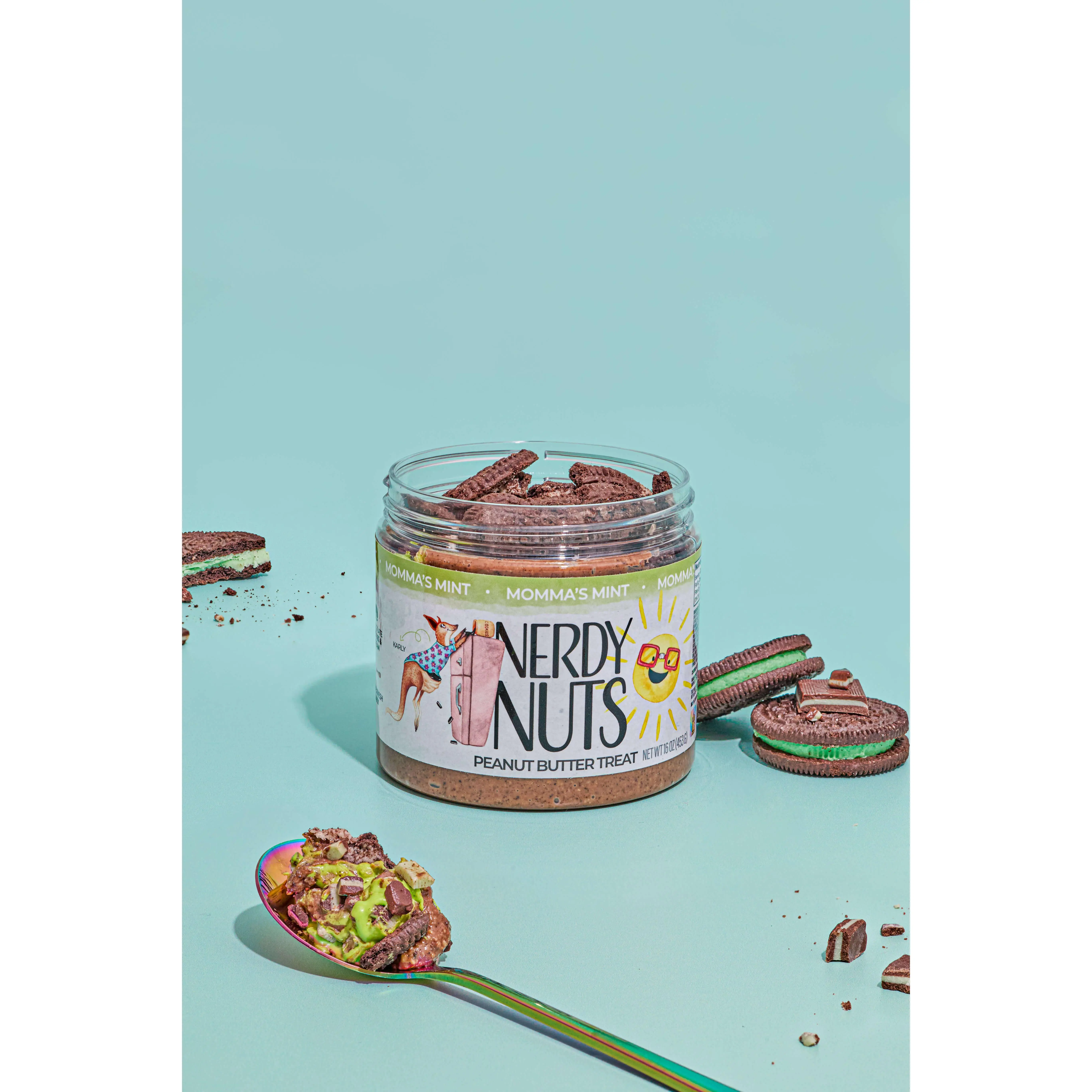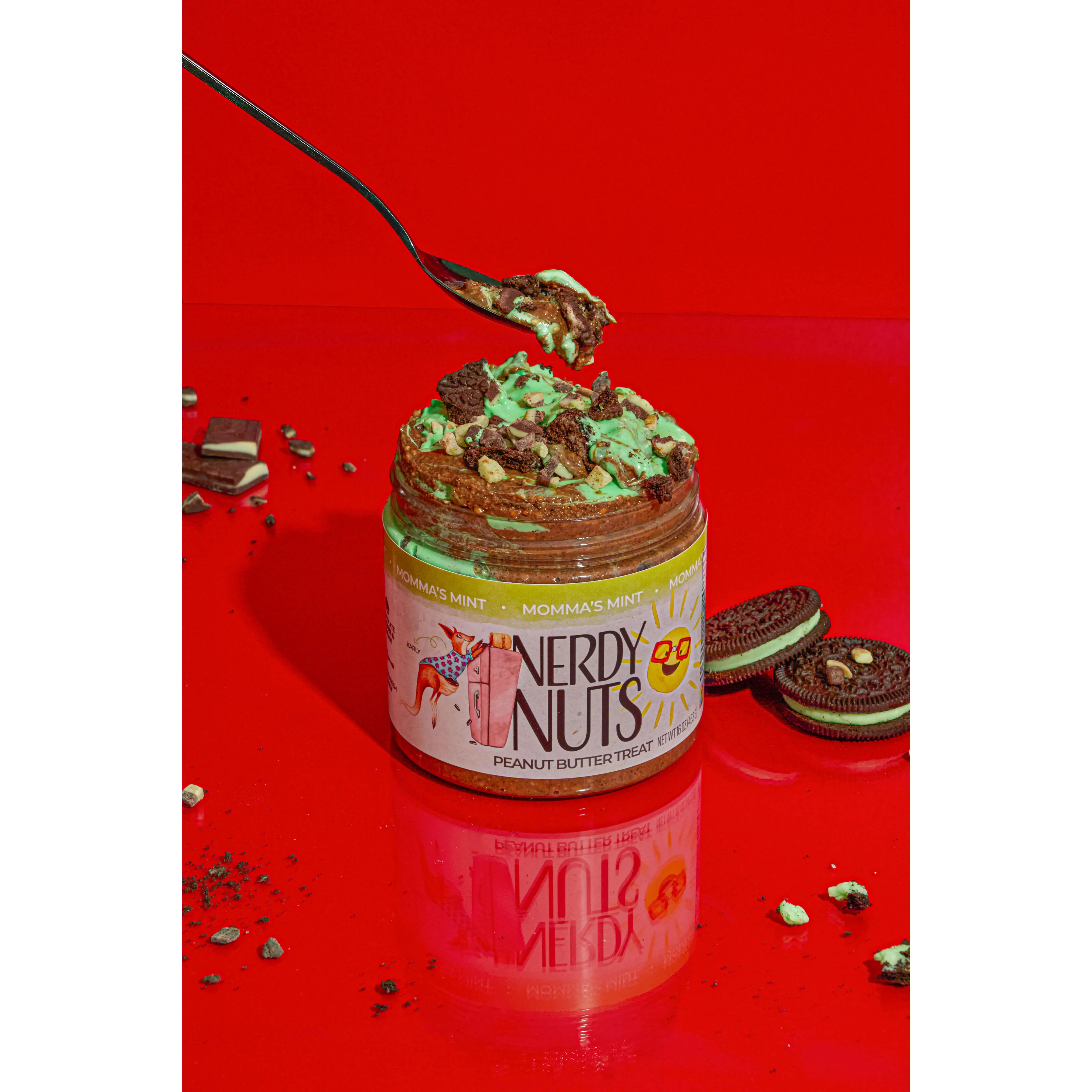 Sweet dark cookies & cream peanut butter is swirled with green minty mallow creme, topped with thin mint cookies and chopped chocolate mint candies!