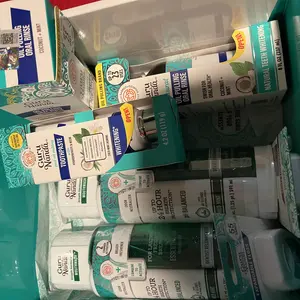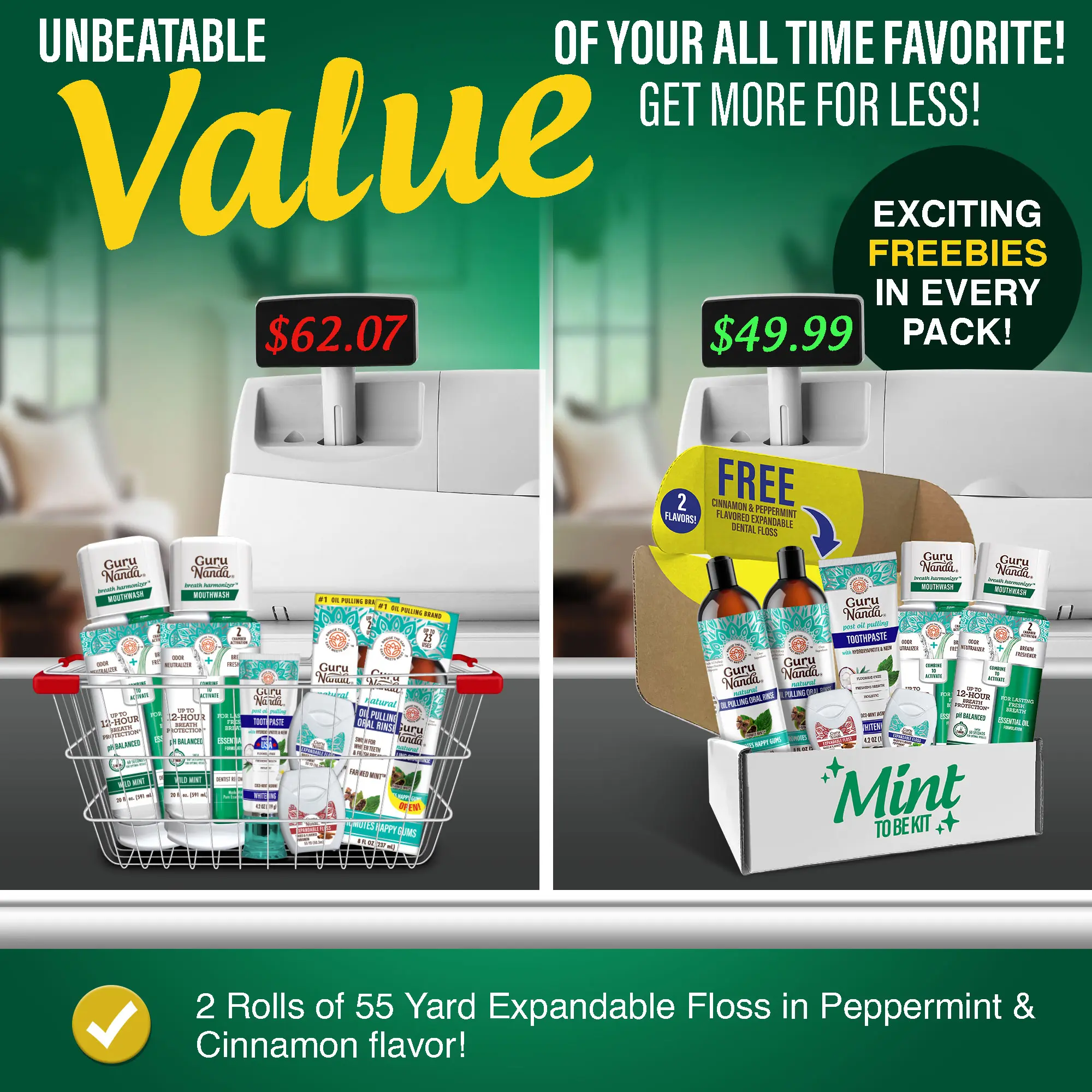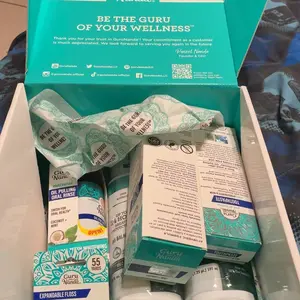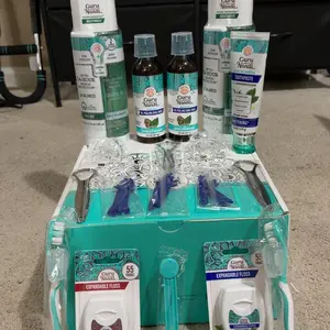 The liquid spilled in the box out the bottles of the oil pulling oral rinse,the floss package is open due to the spill from the oil pulling rinse its a mess,the contents of in the advertisement has more than what I recieved.